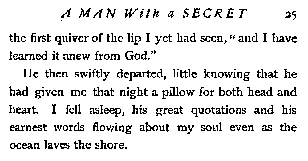 At thought of her, my ambition, earth-born though it was, seemed to be robed in white and to be unashamedly ministering unto God. And I was fain to believe at last that this very hope of a larger place was from Himself, and that He was the shepherd of the sheep and of the goats alike. Whereupon I fell upon my sermons afresh with a clearer conscience, which means a stronger mind, and swiftly prayed, even while I worked, that the Lord of the harvest would winnow my tumultuous thoughts, garnering the wheat unto Himself and burning the tares with unquenchable fire.