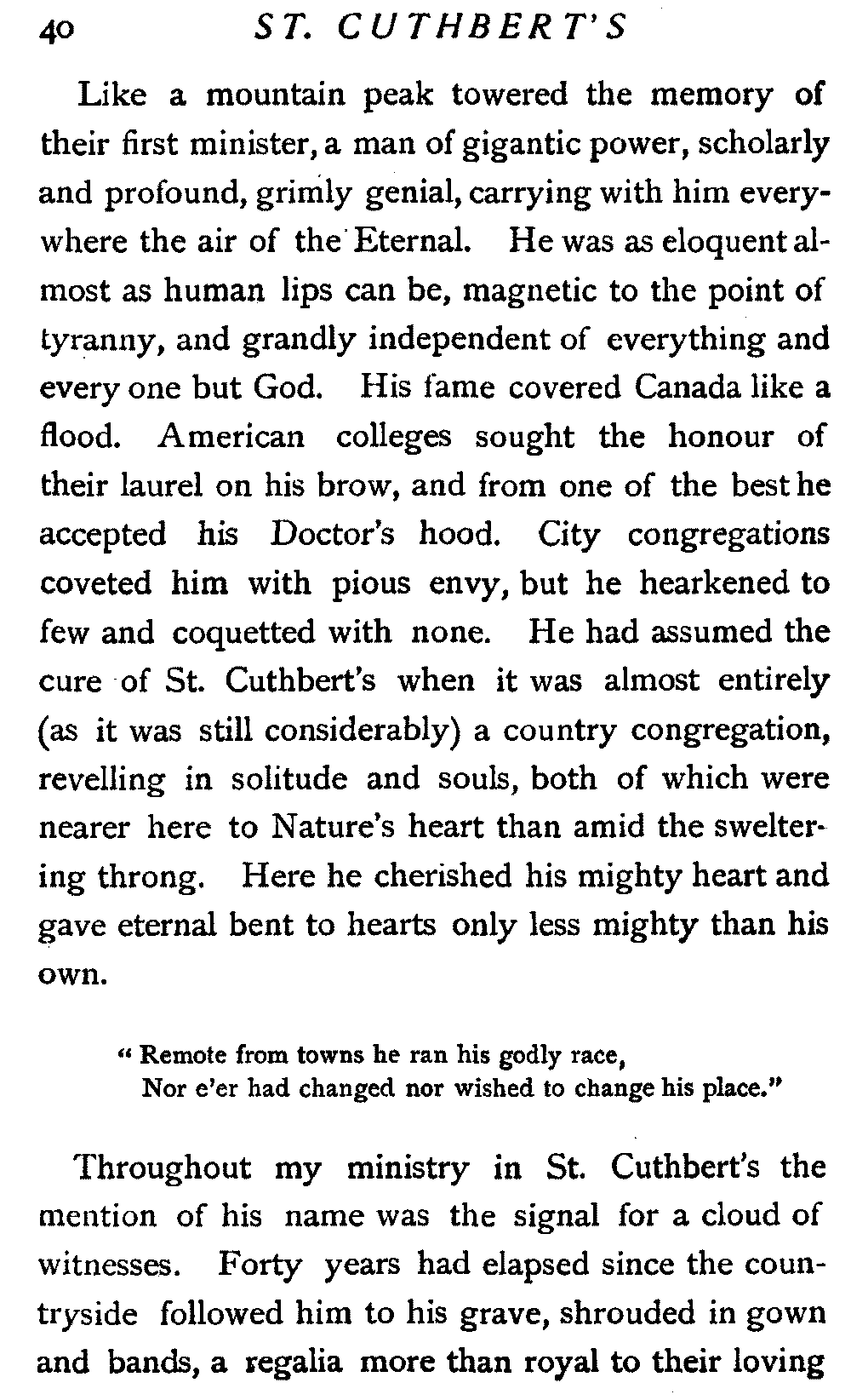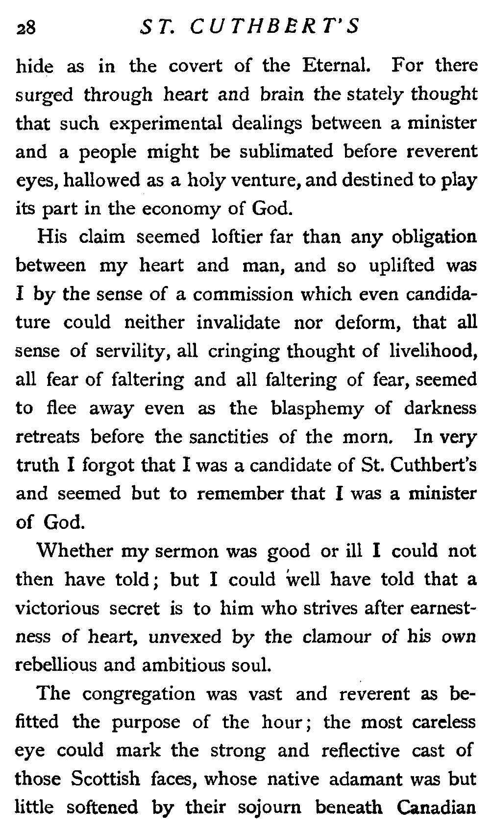 St. Cuthbert's was the stately cathedral of all adjoining Presbyterianism. It was the pride and crown of a town which stood in prosperous contentment upon the verge of cityhood. Its history was great and honourable; its traditions warlike and evangelical; its people intelligent and intense. Its vast area was famed for its throng of acute and reflective hearers, almost every man of whom was a sermon taster, while its officers were the acknowledged possessors of letters patent to the true ecclesiastical no[13]bility. In my student days, medals and scholarships were never quoted among the trophies of our divinity men if it could be justly said of any one that he had preached twice before the hard heads of St. Cuthbert's. This triumph was recited with the same reverent air as when men used to say, "He preached before the Queen."