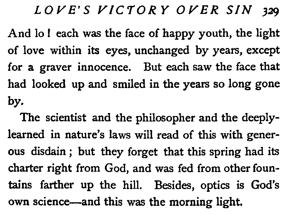 The scientist and the philosopher and the deeply-learned in nature's laws will read of this with generous disdain; but they forget that this spring had its charter right from God, and was fed from other fountains farther up the hill. Besides, optics is God's own science—and this was the morning light.