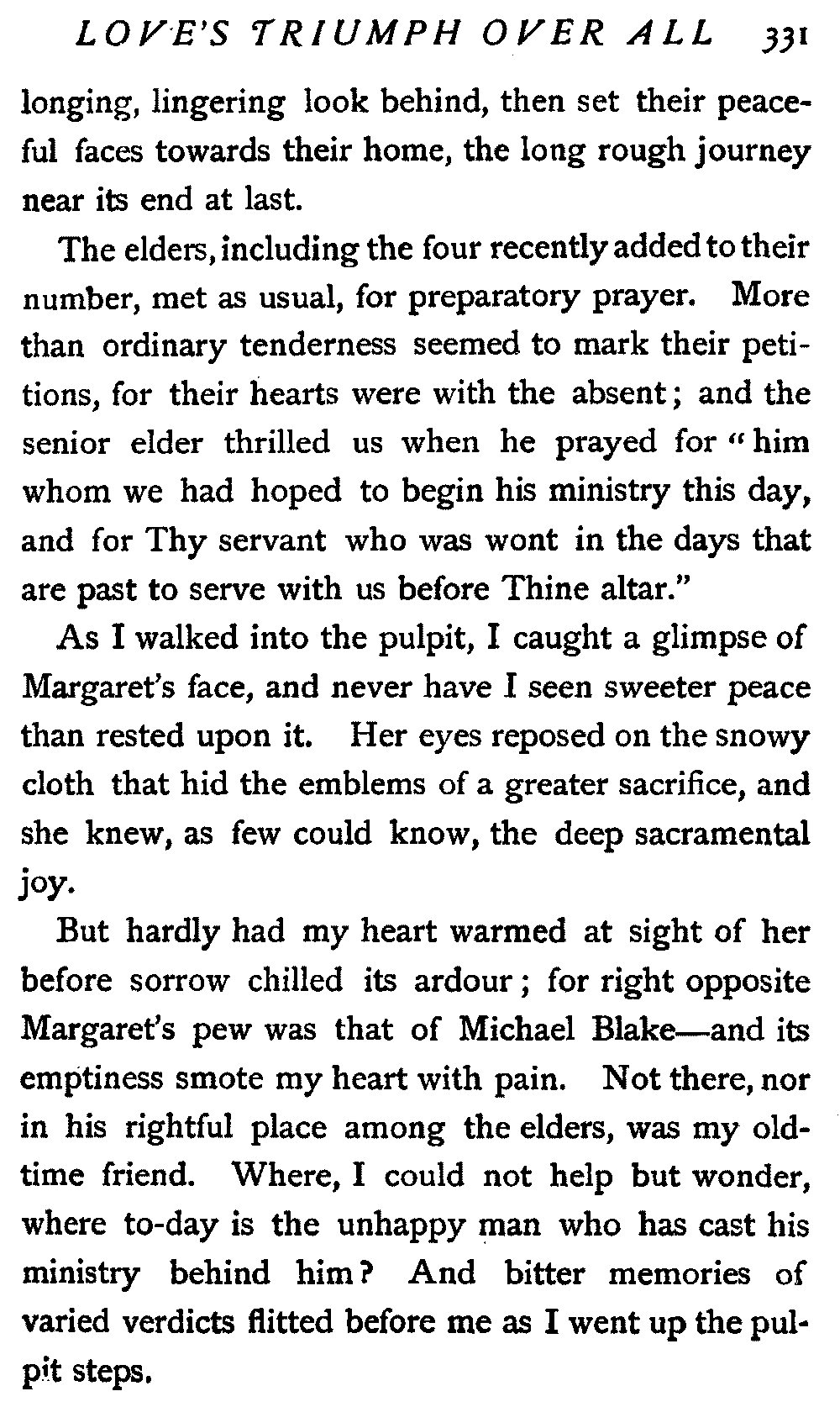 As I walked into the pulpit, I caught a glimpse of Margaret's face, and never have I seen sweeter peace than rested upon it. Her eyes reposed on the snowy cloth that hid the emblems of a greater sacrifice, and she knew, as few could know, the deep sacramental joy.