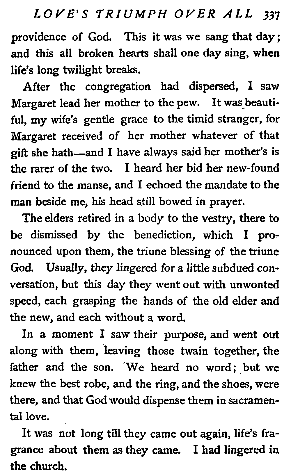 In a moment I saw their purpose, and went out along with them, leaving those twain together, the father and the son. We heard no word; but we knew the best robe, and the ring, and the shoes, were there, and that God would dispense them in sacramental love.