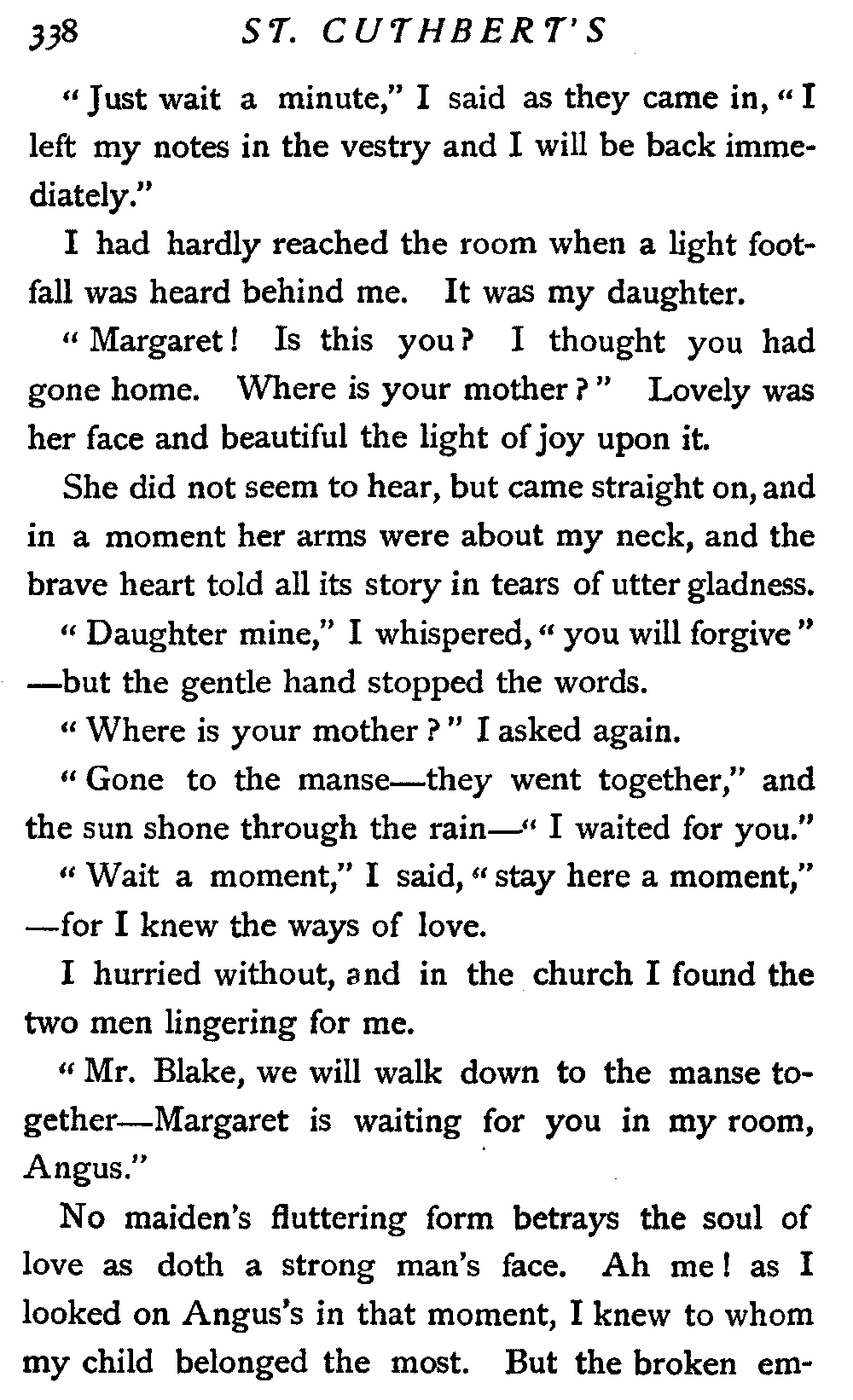 "Mr. Blake, we will walk down to the manse together—Margaret is waiting for you in my room, Angus."