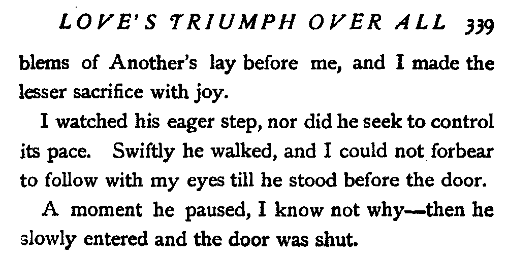 I watched his eager step, nor did he seek to control its pace. Swiftly he walked, and I could not forbear to follow with my eyes till he stood before the door.