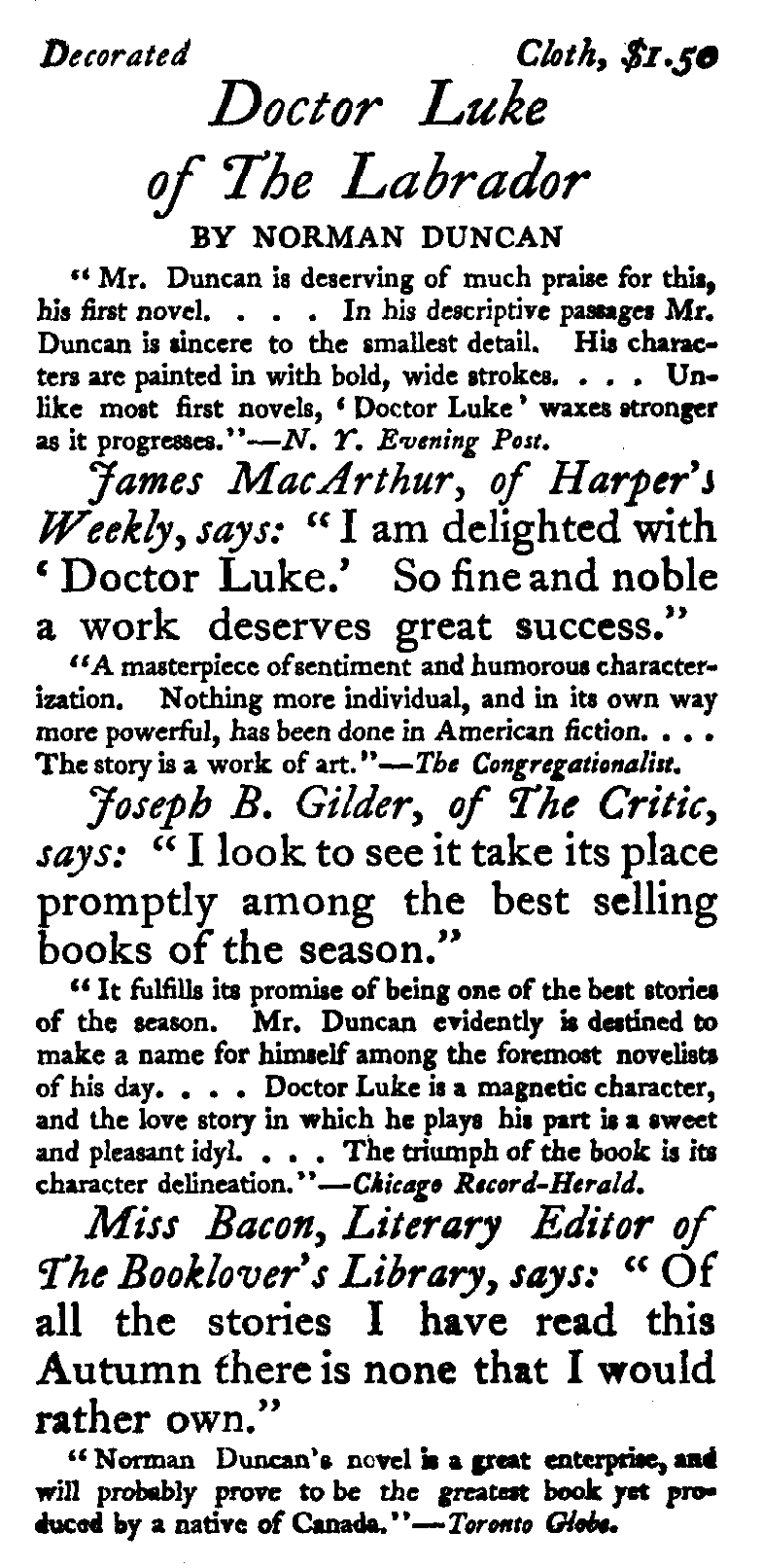 "It fulfills its promise of being one of the best stories of the season. Mr. Duncan evidently is destined to make a name for himself among the foremost novelists of his day.... Doctor Luke is a magnetic character, and the love story in which he plays his part is a sweet and pleasant idyl.... The triumph of the book is its character delineation."—Chicago Record-Herald.
