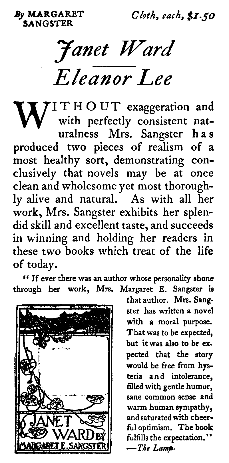 "If ever there was an author whose personality shone through her work, Mrs. Margaret E. Sangster is that author. Mrs. Sangster has written a novel with a moral purpose. That was to be expected, but it was also to be expected that the story would be free from hysteria and intolerance, filled with gentle humor, sane common sense and warm human sympathy, and saturated with cheerful optimism. The book fulfills the expectation."—The Lamp.