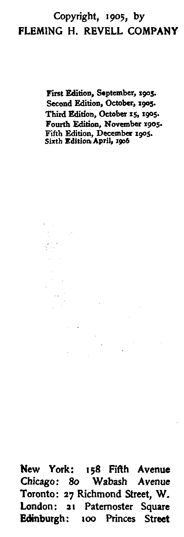 | First Edition, September, 1905. Second Edition, October, 1905. Third Edition, October 15, 1905. Fourth Edition, November 1905. Fifth Edition, December 1905. Sixth Edition, April, 1906. New York: 158 Fifth Avenue Chicago: 80 Wabash Avenue Toronto: 27 Richmond Street, W. London: 21 Paternoster Square Edinburgh: 100 Princes Street |
