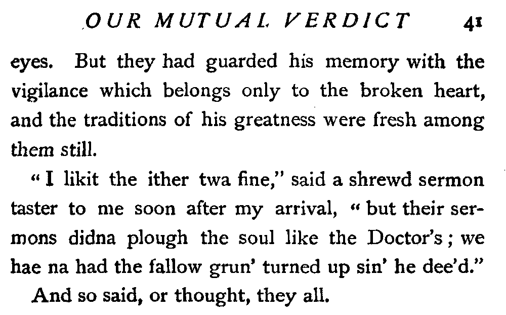 "Mind ye," he declared fervently, "I'm no' settin' mysel' up even wi' the minister. I regard him as mair important than me—far mair important," he affirmed, with reckless humility, "but the elders, they are juist common fowk like mysel'. An' at times they are mair than common. Me an' the minister bear a deal frae the elders. He aye bids me to bear wi' them, an' I aye bid him no' to mind. I tell him whiles that we'd meet an' we'd greet whaur the elders cease frae troublin'—them's the poet's words."