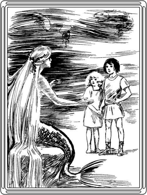 When the mermaid saw them she flung her golden tresses back over her snow-white shoulders, and she beckoned the children to her. Her large eyes were full of sadness; but there was a look so tender upon her face that the children moved towards her without any fear.