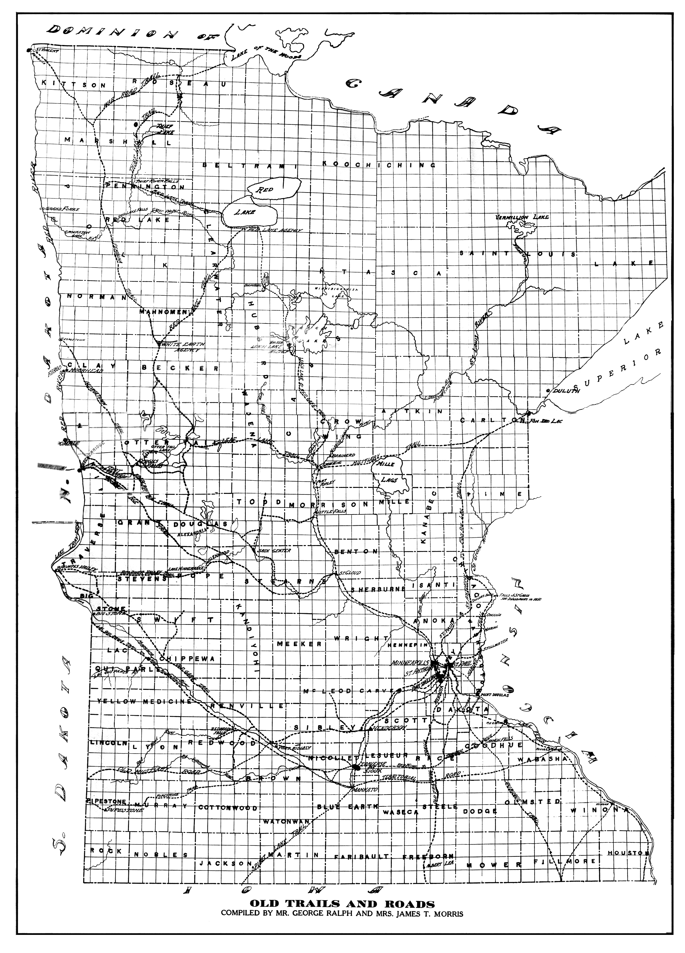 During my search for a map of the Old Trails and Roads of Minnesota, public libraries were thoroughly investigated, but no book or map could be found showing these old highways. A few old maps in the Historical Library bore snatches of them, but in their entirety they had disappeared from books and maps, as well as from our state.