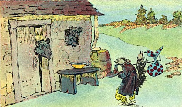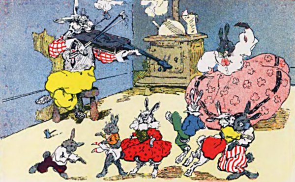 “Brer Wolf ain’t say nothin’, but make out he’s grabblin’, an’ den, all of a sudden, he made a dash at Brer Rabbit, but when he git whar Brer Rabbit wuz at, Brer Rabbit ain’t dar no mo’; he done gone. Weak an’ hongry ez he is, Brer Wolf know dat he can’t ketch Brer Rabbit, an’ so he holler out, ‘hat’s yo’ hurry, Brer Rabbit? Whar you gwine?’ Brer Rabbit holler back, ‘I’m gwine home atter a bag fer ter tote de gol’ you gwine leave me! So long, Brer Wolf; I wish you mighty well!’ an’ wid dat he put out fer home.”