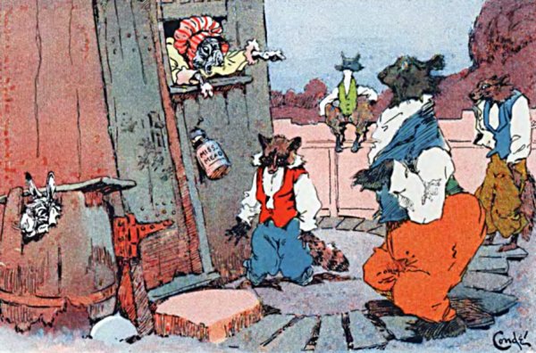 The little boy, when he next saw Uncle Remus, after hearing how the animals went to the barbecue, wanted to know what happened to them: he was anxious to learn if any of them were hurt by the dogs that had been chasing Brother Rabbit. The old darkey closed his eyes and chuckled. “You sho is axin’ sump’n now, honey. Und’ his hat, ef he had any, Brer Rabbit had a mighty quick thinkin’ apple-ratus, an’ mos’ inginner’lly, all de time, de pranks he played on de yuther creeturs pestered um bofe ways a-comin’ an’ a-gwine. De dogs done mighty well, ’long ez dey had dealin’s wid de small fry, like Brer Fox, an’ Brer Coon, an’ Brer Wolf, but when dey run ag’in’ ol’ Brer B’ar, dey sho struck a snag. De mos’ servigrous wuz de identual one dat got de wust hurted. He got too close ter Brer B’ar, an’ when he look at hisse’f in runnin’ water, he tuck notice dat he wuz split wide open fum flank ter dewlap.
