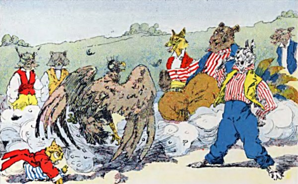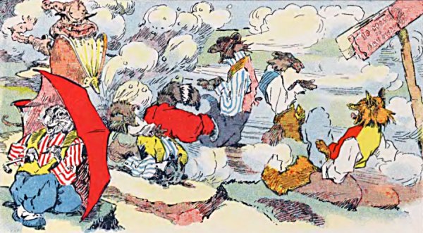 “An’ den, gentermens! de race begun fer ter commence. Uncle Win’ hep’d um bofe; he had his bellows wid ’im, an’ he blow’d it! Brer Dust got up fum whar he wuz a-layin’ at, an’ come down de road des a-whirlin’. He stricken ol’ Brer B’ar fust, den Brer Wolf, an’ den Brer Fox, an’ atter dat, all de yuther creeturs, an’ it come mighty nigh smifflicatin’ um! Not never in all yo’ born days is you y’ever heern sech coughin’ an’ sneezin’, sech snortin’ an’ wheezin’! An’ dey all look like dey wuz painted red. Brer B’ar sneeze so hard dat he hatter lay down in de road, an’ Brer Dust come mighty nigh buryin’ ’im, an’ ’twuz de same wid de yuther creeturs—dey got der y’ears, der noses, an’ der eyeses full.