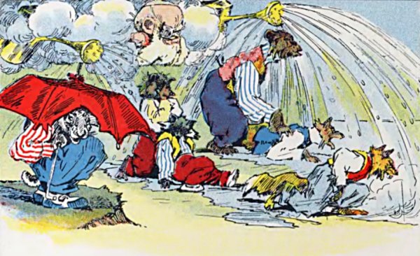 “An’ den Cousin Rain come ’long, a-pursuin’ Brer Dust, an’ he come mighty nigh drownin’ um. He left um kivver’d wid mud, an’ dey wuz wuss off dan befo’. It wuz de longest ’fo’ dey kin git de mud out ’n der eyes an’ y’ears, an’ when dey git so dey kin see a leetle bit, dey tuck notice dat Brer Rabbit, stidder bein’ full er mud, wuz ez dry ez a chip, ef not dryer.