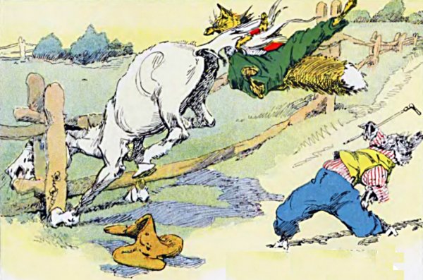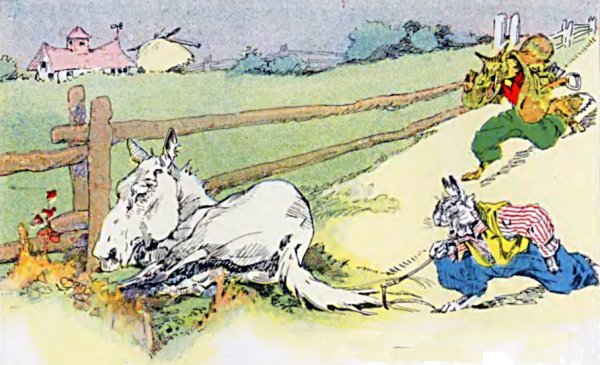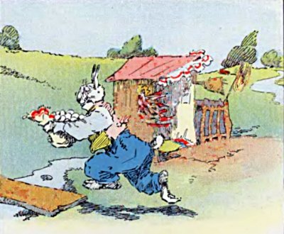“It make um so mad, dat dey all put out atter ’im, an’ try der level best fer ter ketch, but ef dey wuz anything in de roun’ worl’ dat Brer Rabbit’s got, it’s soople foots, an’ ’twant no time ’fo’ de yuther creeturs can’t see ha’r ner hide un ’im! All de same Brer Rabbit aint bargain fer ter have two races de same day.”