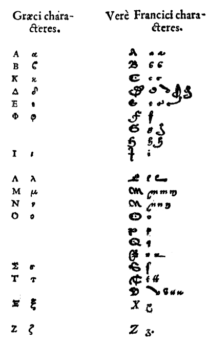 Sunt autem Francis literæ viginti & vna. Nam duarum quę à nonnullis adiiciuntur vna quidem nempe k, nullius est vsus, vt scribi quidem Francica lingua ab omni penè æuo consueuit: altera verò nempe y quam i Græcum appellant per inscitiam irrepsit, quum sit duplex ii vocale, vt suo loco ostendemus. Harum autem characteres, non ij quibus Typographi vtuntur siue Romani, siue Italici, siue Gotthici quos vocant, sed hi sunt verè Francici -11- quos subieci cum Gręcis, à quibus manifestè sunt plerique desumpti, vt mirari nonnulli desinant repertas à Cæsare in Heluetiorum castris tabulas Græcis literis exaratas.