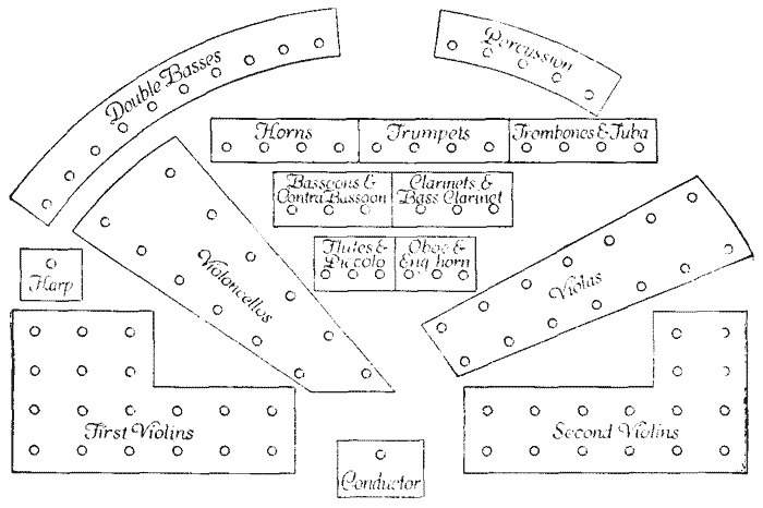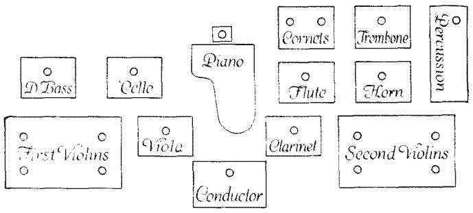 [18] On the other hand, the criticism has been made in recent years that certain orchestral conductors have not sufficiently taken into consideration the size and acoustics of the auditoriums in which they were conducting, and have made their pianissimos so soft that nothing at all could be heard in the back of the room. In order to satisfy himself that the tone is as soft as possible, and yet that it is audible, it will be well for the conductor to station some one of good judgment in the back of the auditorium during the concert, this person later reporting to the conductor in some detail the effect of the performance.
