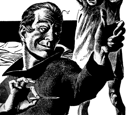 When Ferraro rolled into his study after dinner the room was dark. I heard him murmur something about the servants and fumble for the switch. Before he found it, the robot closed the door and turned on the lights. I sat behind his desk, all his personal papers before me—weighted down with a pistol—and as fierce a scowl as I could raise smeared across my face. Before he got over the shock I snapped an order at him.