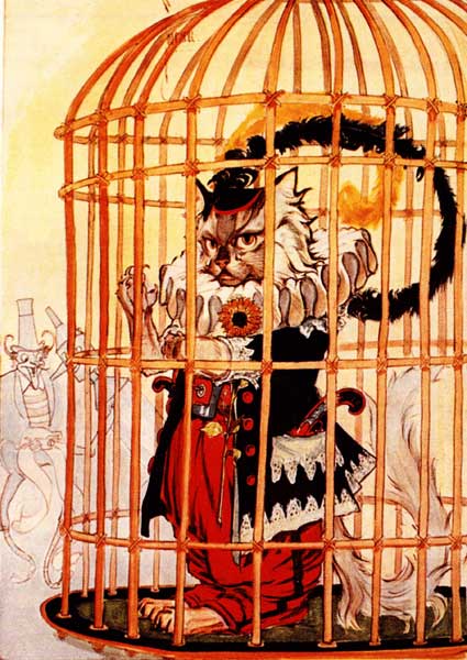 Princess Ozma, dressed in her most splendid robes of state, sat in the magnificent emerald throne, with her jewelled sceptre in her hand and her sparkling coronet upon her fair brow. Behind her throne stood the twenty-eight officers of her army and many officials of the royal household. At her right sat the queerly assorted Jury—animals, animated dummies and people—all gravely prepared to listen to what was said. The kitten had been placed in a large cage just before the throne, where she sat upon her haunches and gazed through the bars at the crowds around her, with seeming unconcern.[Pg 241]