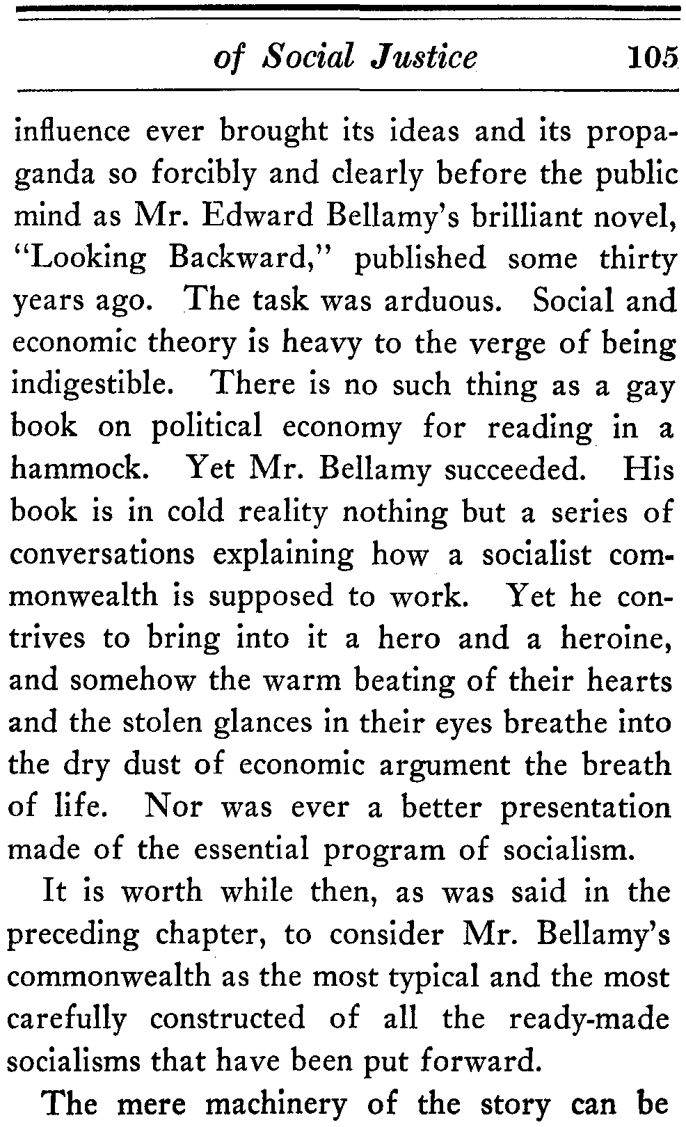 So it has been with socialism. No single[105] influence ever brought its ideas and its propaganda so forcibly and clearly before the public mind as Mr. Edward Bellamy's brilliant novel, "Looking Backward," published some thirty years ago. The task was arduous. Social and economic theory is heavy to the verge of being indigestible. There is no such thing as a gay book on political economy for reading in a hammock. Yet Mr. Bellamy succeeded. His book is in cold reality nothing but a series of conversations explaining how a socialist commonwealth is supposed to work. Yet he contrives to bring into it a hero and a heroine, and somehow the warm beating of their hearts and the stolen glances in their eyes breathe into the dry dust of economic argument the breath of life. Nor was ever a better presentation made of the essential program of socialism.