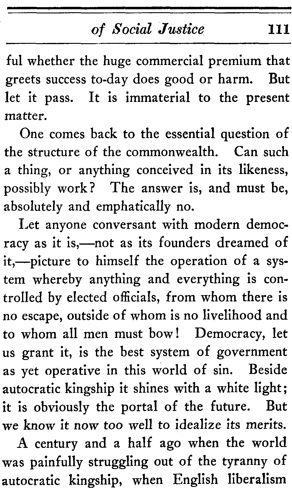 Let anyone conversant with modern democracy as it is,—not as its founders dreamed of it,—picture to himself the operation of a system whereby anything and everything is controlled by elected officials, from whom there is no escape, outside of whom is no livelihood and to whom all men must bow! Democracy, let us grant it, is the best system of government as yet operative in this world of sin. Beside autocratic kingship it shines with a white light; it is obviously the portal of the future. But we know it now too well to idealize its merits.