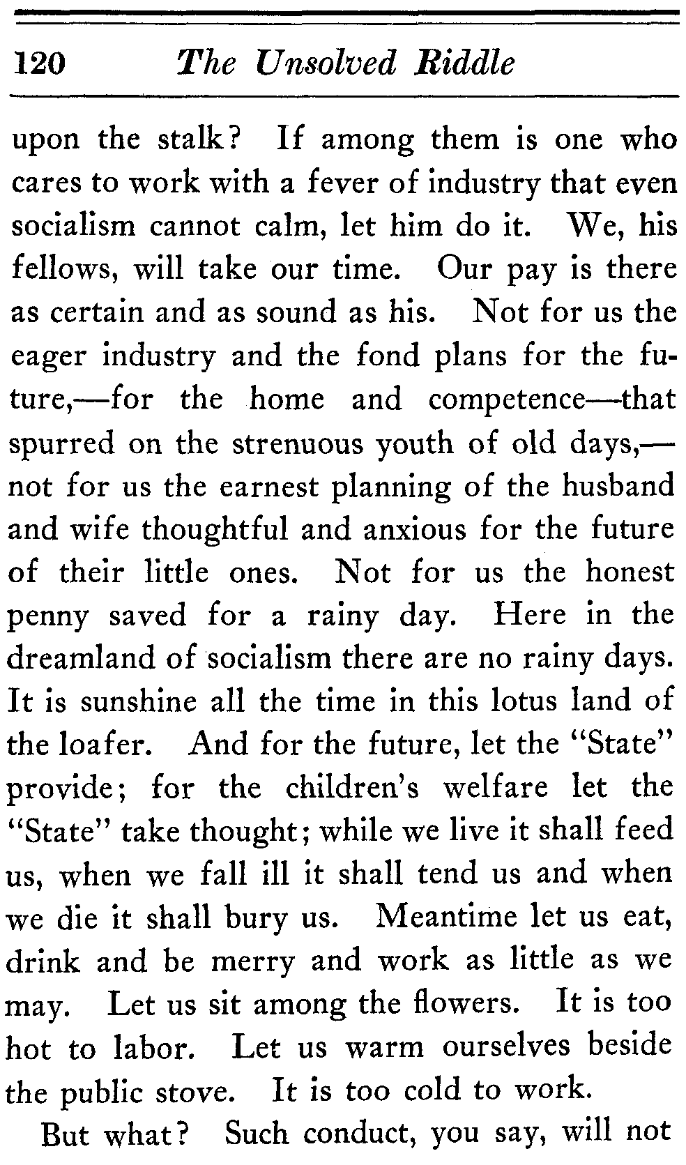 Or try, if one will, the other horn of the dilemma. That, too, one will find as ill a resting place as an upright thistle. Let the wages,—as with Mr. Bellamy,—all be equal. The managers then cannot vote themselves large emoluments if they try. But what about the purple citizens? Will they work, or will they lie round in their purple garments and loaf? Work? Why should they work, their pay is there "fresh and fresh"? Why should they turn up on time for their task? Why should they not dawdle at their labor sitting upon the fence in endless colloquy while the harvest rots[120] upon the stalk? If among them is one who cares to work with a fever of industry that even socialism cannot calm, let him do it. We, his fellows, will take our time. Our pay is there as certain and as sound as his. Not for us the eager industry and the fond plans for the future,—for the home and competence—that spurred on the strenuous youth of old days,—not for us the earnest planning of the husband and wife thoughtful and anxious for the future of their little ones. Not for us the honest penny saved for a rainy day. Here in the dreamland of socialism there are no rainy days. It is sunshine all the time in this lotus land of the loafer. And for the future, let the "State" provide; for the children's welfare let the "State" take thought; while we live it shall feed us, when we fall ill it shall tend us and when we die it shall bury us. Meantime let us eat, drink and be merry and work as little as we may. Let us sit among the flowers. It is too hot to labor. Let us warm ourselves beside the public stove. It is too cold to work.