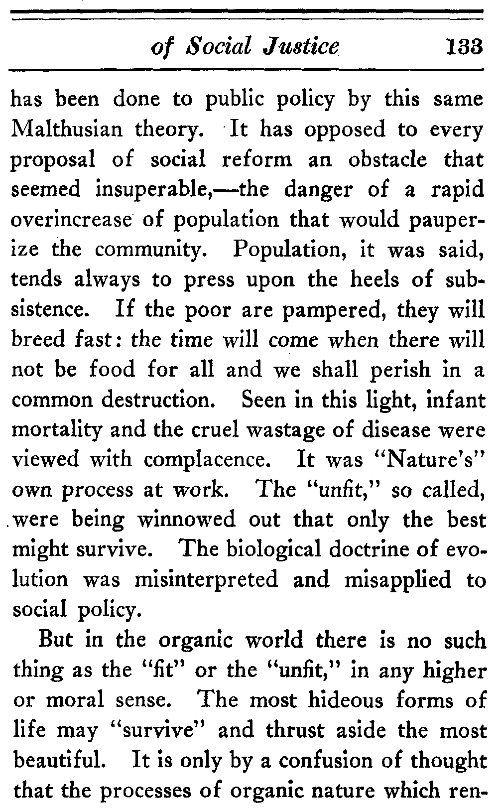 It is difficult to over-estimate the harm that[133] has been done to public policy by this same Malthusian theory. It has opposed to every proposal of social reform an obstacle that seemed insuperable,—the danger of a rapid overincrease of population that would pauperize the community. Population, it was said, tends always to press upon the heels of subsistence. If the poor are pampered, they will breed fast: the time will come when there will not be food for all and we shall perish in a common destruction. Seen in this light, infant mortality and the cruel wastage of disease were viewed with complacence. It was "Nature's" own process at work. The "unfit," so called, were being winnowed out that only the best might survive. The biological doctrine of evolution was misinterpreted and misapplied to social policy.
