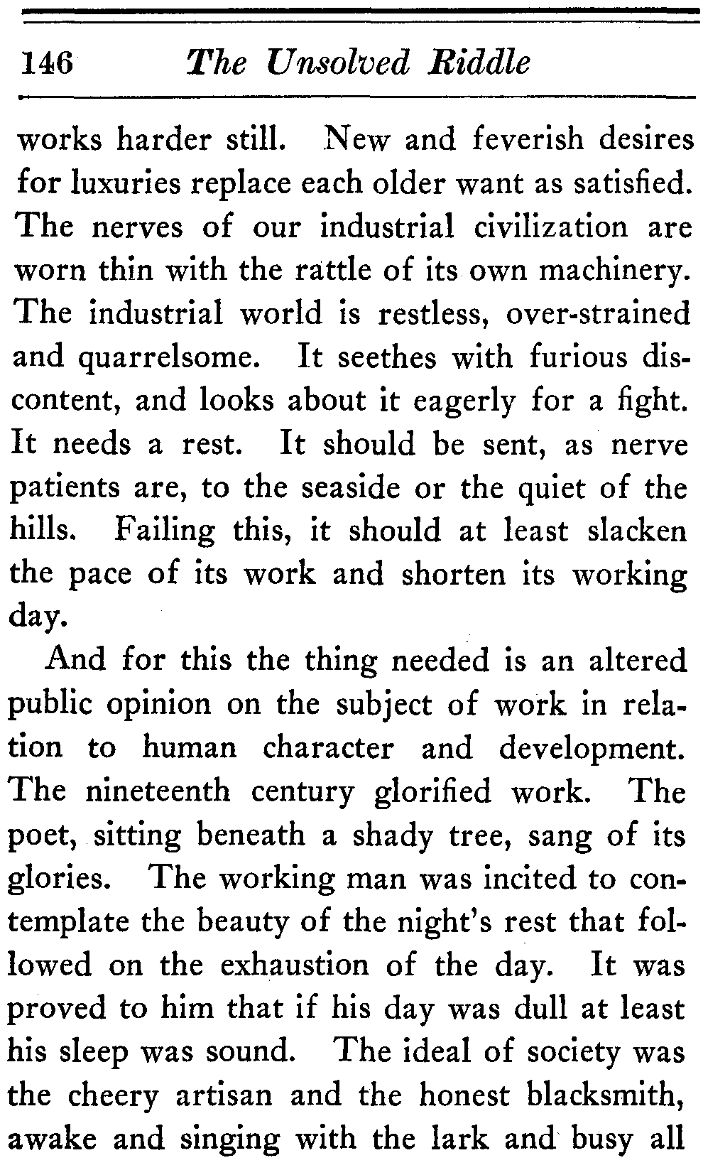 And for this the thing needed is an altered public opinion on the subject of work in relation to human character and development. The nineteenth century glorified work. The poet, sitting beneath a shady tree, sang of its glories. The working man was incited to contemplate the beauty of the night's rest that followed on the exhaustion of the day. It was proved to him that if his day was dull at least his sleep was sound. The ideal of society was the cheery artisan and the honest blacksmith, awake and singing with the lark and busy all[147] day long at the loom and the anvil, till the grateful night soothed them into well-earned slumber. This, they were told, was better than the distracted sleep of princes.
