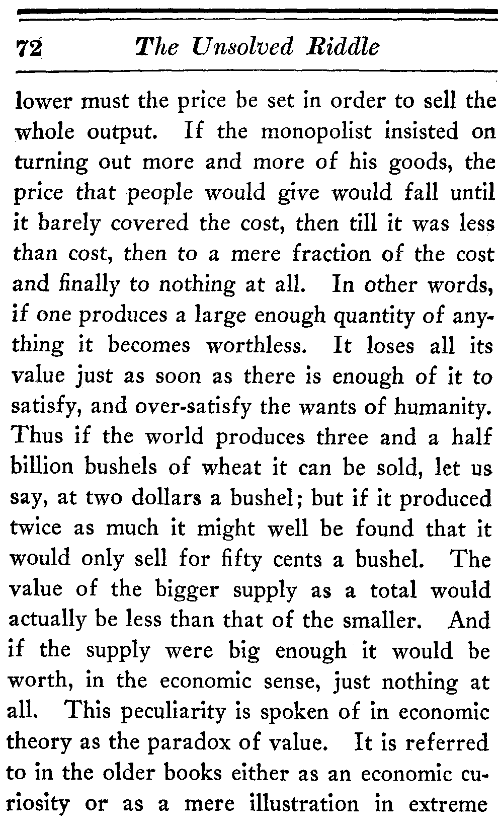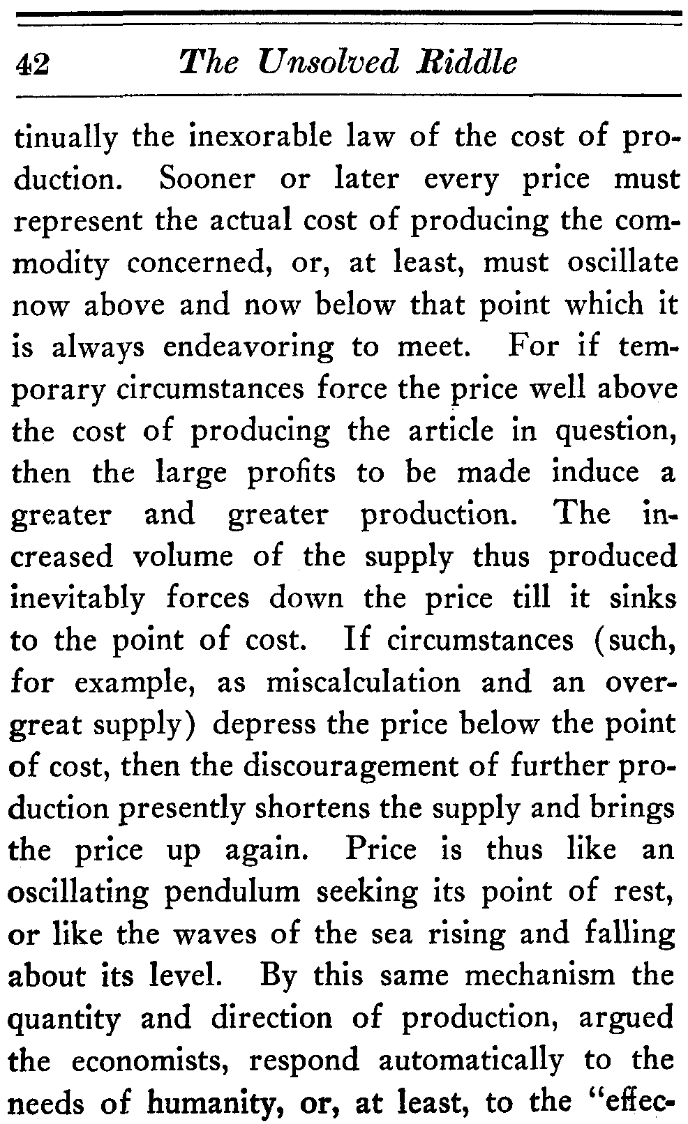 The argument of the classicists ran thus. If there is everywhere complete economic freedom, then there will ensue in consequence a régime of social justice. If every man is allowed to buy and sell goods, labor and property, just as suits his own interest, then the prices and wages that result are either in the exact measure of social justice or, at least, are perpetually moving towards it. The price of any commodity at any moment is, it is true, a "market price," the resultant of the demand and the supply; but behind this operates con[42]tinually the inexorable law of the cost of production. Sooner or later every price must represent the actual cost of producing the commodity concerned, or, at least, must oscillate now above and now below that point which it is always endeavoring to meet. For if temporary circumstances force the price well above the cost of producing the article in question, then the large profits to be made induce a greater and greater production. The increased volume of the supply thus produced inevitably forces down the price till it sinks to the point of cost. If circumstances (such, for example, as miscalculation and an over-great supply) depress the price below the point of cost, then the discouragement of further production presently shortens the supply and brings the price up again. Price is thus like an oscillating pendulum seeking its point of rest, or like the waves of the sea rising and falling about its level. By this same mechanism the quantity and direction of production, argued the economists, respond automatically to the needs of humanity, or, at least, to the "effec[43]tive demand," which the classicist mistook for the same thing. Just as much wheat or bricks or diamonds would be produced as the world called for; to produce too much of any one thing was to violate a natural law; the falling price and the resulting temporary loss sternly rebuked the producer.