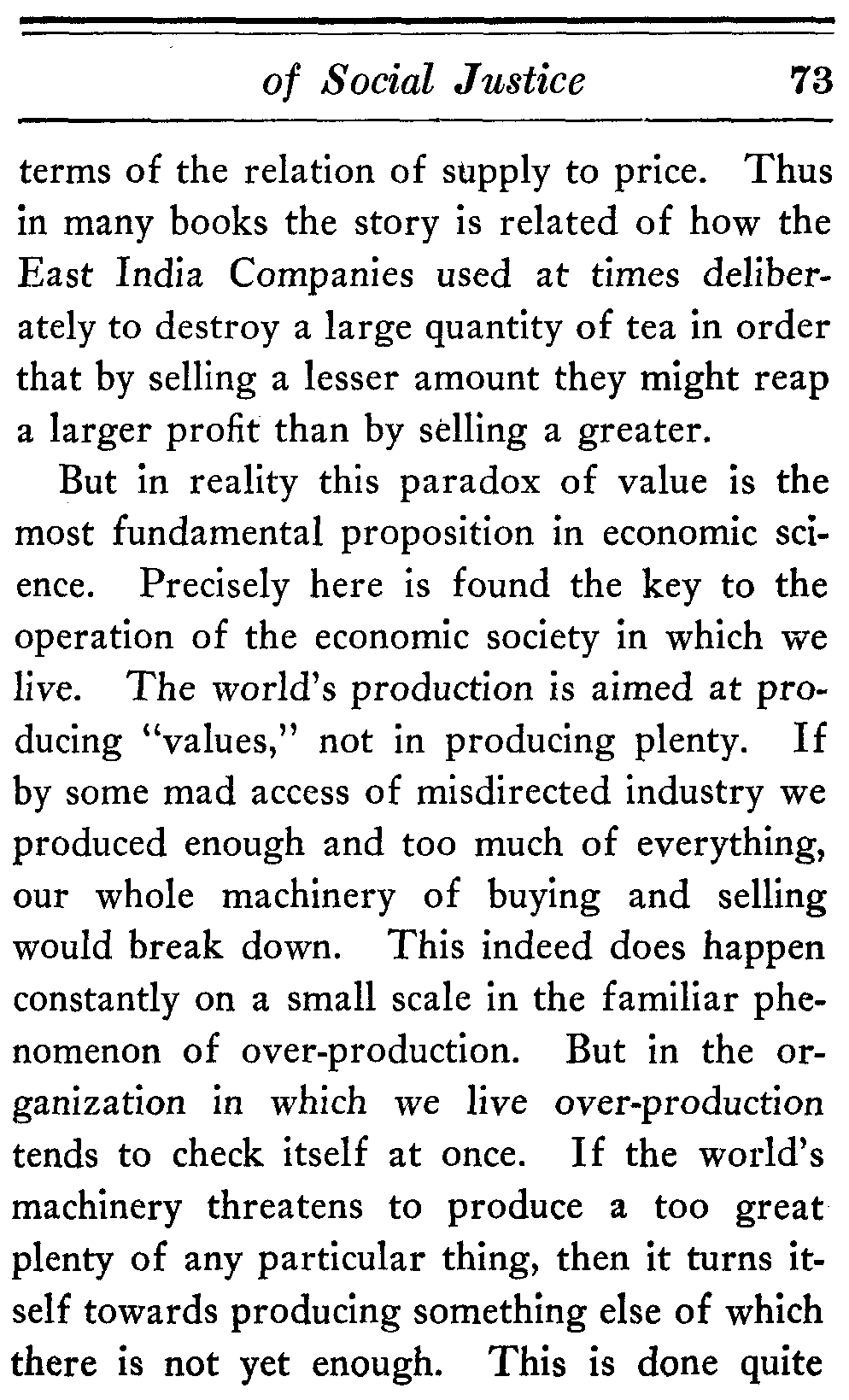 But consider for a moment the peculiar nature of the limitations themselves. Every man's limit of what he can pay and what he can take, of how much he can offer and how much he will receive, is based on the similar limitations of other people. They are reciprocal to one another. Why should one factory owner not pay ten dollars a day to his hands? Because the others don't. But suppose they all do? Then the output could not be sold at the present price. But why not sell the produce at a higher price? Because at a higher price the consumer can't afford to buy it. But sup[53]pose that the consumer, for the things which he himself makes and sells, or for the work which he performs, receives more? What then? The whole thing begins to have a jigsaw look, like a child's toy rack with wooden soldiers on it, expanding and contracting. One searches in vain for the basis on which the relationship rests. And at the end of the analysis one finds nothing but a mere anarchical play of forces, nothing but a give-and-take resting on relative bargaining strength. Every man gets what he can and gives what he has to.