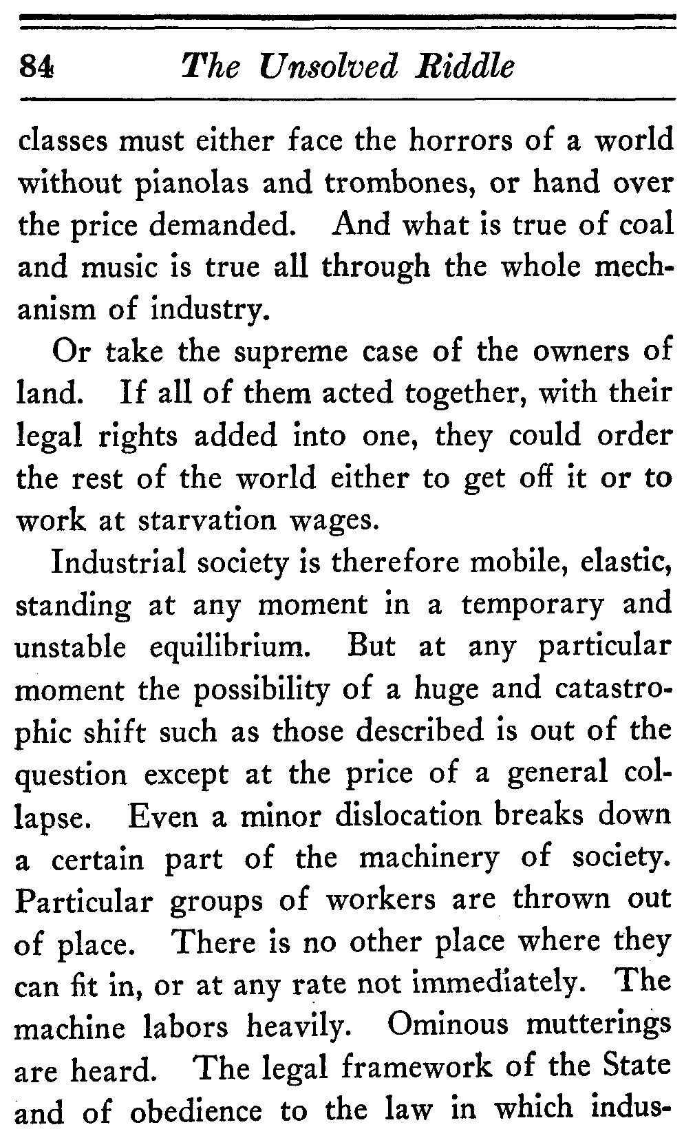 Industrial society is therefore mobile, elastic, standing at any moment in a temporary and unstable equilibrium. But at any particular moment the possibility of a huge and catastrophic shift such as those described is out of the question except at the price of a general collapse. Even a minor dislocation breaks down a certain part of the machinery of society. Particular groups of workers are thrown out of place. There is no other place where they can fit in, or at any rate not immediately. The machine labors heavily. Ominous mutterings are heard. The legal framework of the State and of obedience to the law in which indus[85]trial society is set threatens to break asunder. The attempt at social change threatens a social revolution in which the whole elaborate mechanism would burst into fragments.