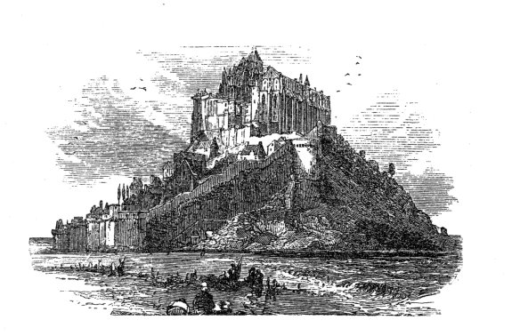 Beneath and adjacent to the Mount, is the little island of La Tombeleine or tombeau d'-Helène, so called from a young lady of that name, who unable to accompany her lover knight when he left for England with the Conqueror, as soon as the vessel which carried him away disappeared from her sight, laid down on the shore and died. Every year, on the anniversary of her death, the fishermen will tell you they see a dove seated upon the Tombeleine rock, and remain there till morning's dawn.