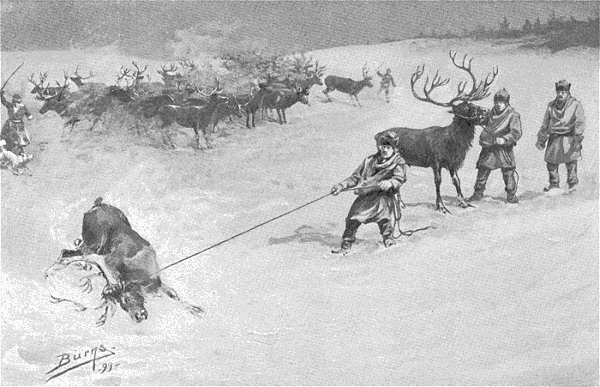 Towards three o'clock in the morning we started. We saw many herds of reindeer—they were moving westward towards the mountains that stretched to the Arctic Sea. It was a grand sight. I saw more than thirty thousand reindeer that day, in herds from one thousand to two or three thousand. The Lapps on their skees, with their dogs, urged the animals onward, and the dogs brought those which were trying to go astray, or lagged behind, into the ranks.