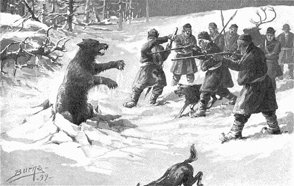 The next morning men gathered, taking their guns and big long sticks, with pikes at the ends to prod the bear with; and all the dogs of the place followed us. Many men started on their skees, others in their sleighs. According to Mikel the bear was about thirty miles away.