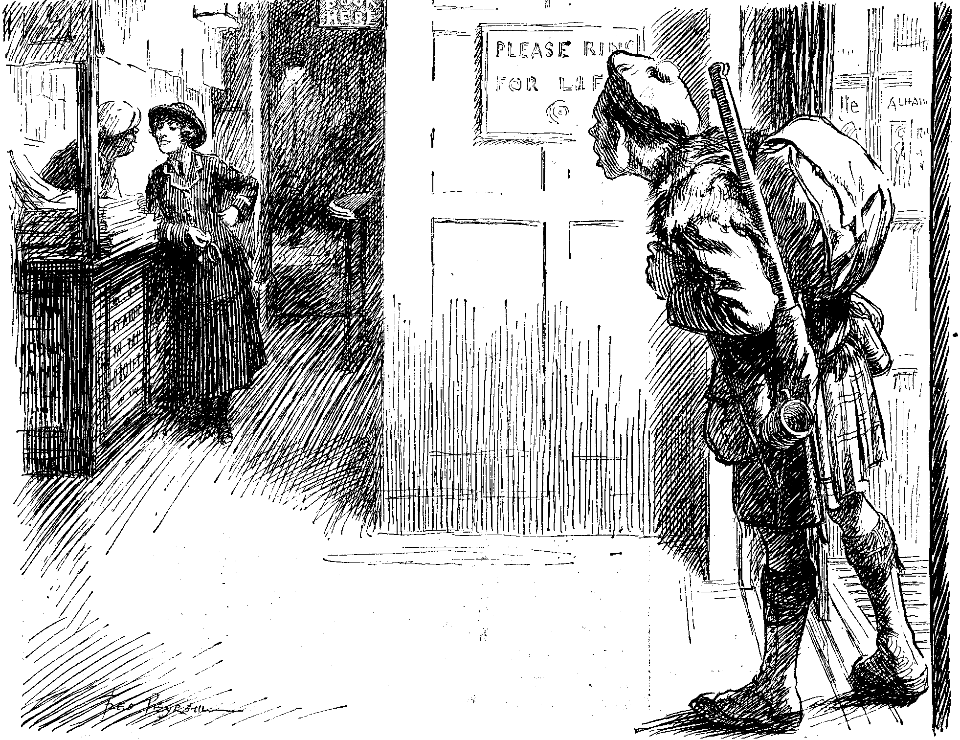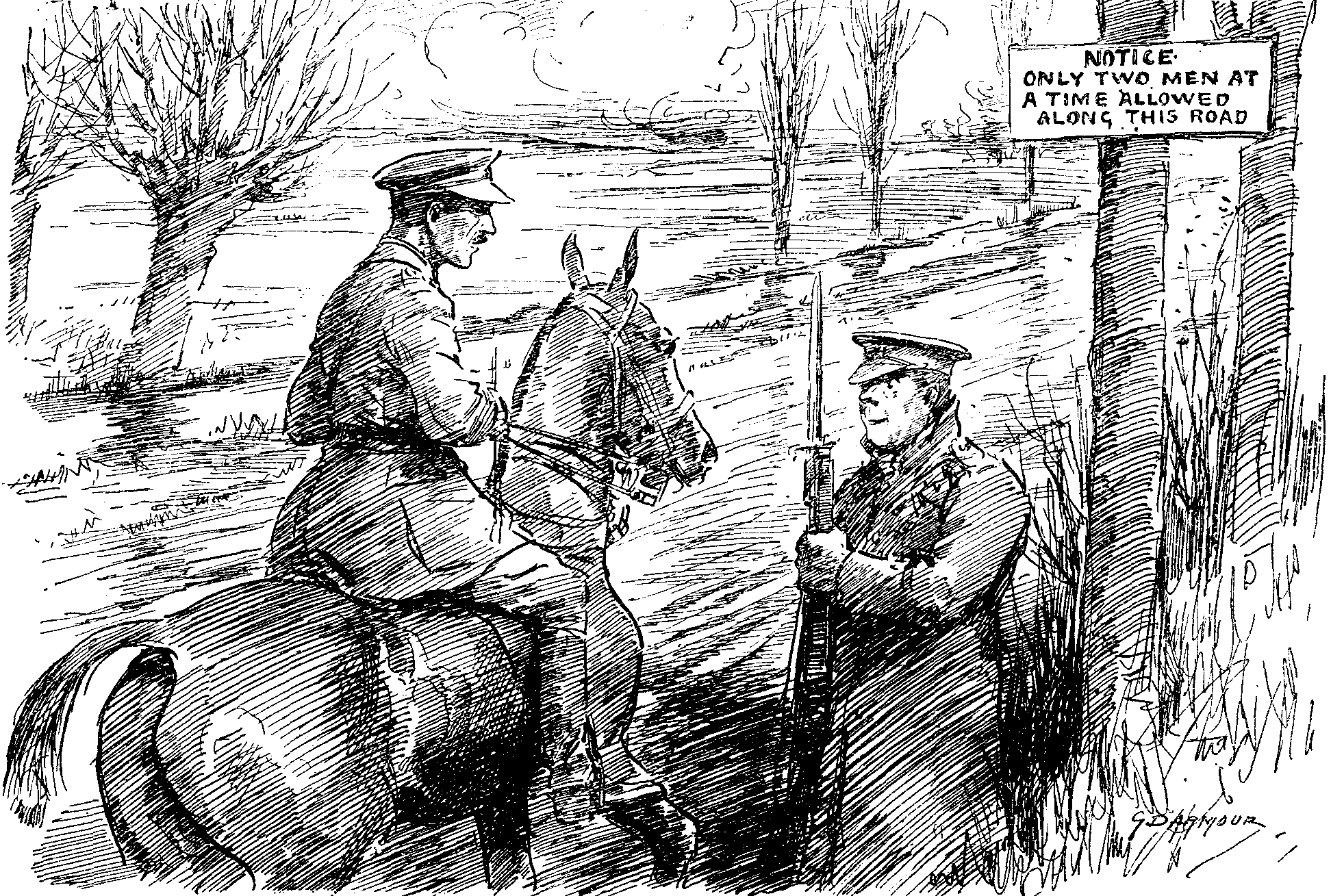 Irish Sentry (placed, to enforce an order, on road which is shelled by enemy whenever used by a body of men). "Ye'll have to wait, Sorr, for somewan else to go wid ye before ye can pass along here."