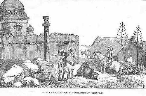 Mr Male, who succeeded Mr Jenkins at Goobbe, has left upon record a further account of what happened to the idol Runga. He says, “One day in August, 1842, as I was returning from Toomcoor to Goobbe, I overtook a Brahman, and in the course of conversation he enquired whether or not I had heard of what had befallen Singonahully Runga Swami. I replied that I had not. He then said, ‘Runga Swami has been thrown out of his temple, and is now outside the door among the stones.’