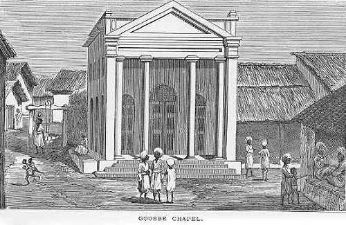 Mrs Hodson laid the foundation brick of the Goobbe Mission House on the 24th of May, 1838. The building was finished on the 17th of August following, and cost 180 pounds. A few days after it was finished, Mr and Mrs John Jenkins, with their child, came to live at Goobbe, and had half the new house (namely, one large room and two small ones) given up to them; the two mission families cheerfully sacrificing a few comforts for the benefit of having an additional preacher in the Circuit. We have seen how Daniel, even when a lad, and without the gospel, treated idols and idolatry; but after the gospel had been preached to him and to his neighbours, the people of his village came round very much to his opinion, greatly to the encouragement of the Missionaries.