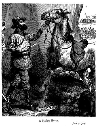 The animal does not go clear off, but keeps circling round, as if it desired to come back again; the presence of the other horse attracting, and giving it confidence. Clancy calls to it, gesticulating in a friendly manner, and uttering exclamations of encouragement. By little and little, it draws nearer, till at length its muzzle is in contact with that of his own steed; and, seizing the bridle, he secures it.