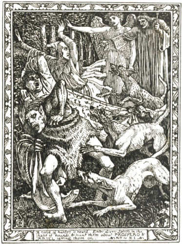 A noise of hunters is heard. Enter divers spirits in the shape of hounds, and hunt them about: Prospero and Ariel setting them on.