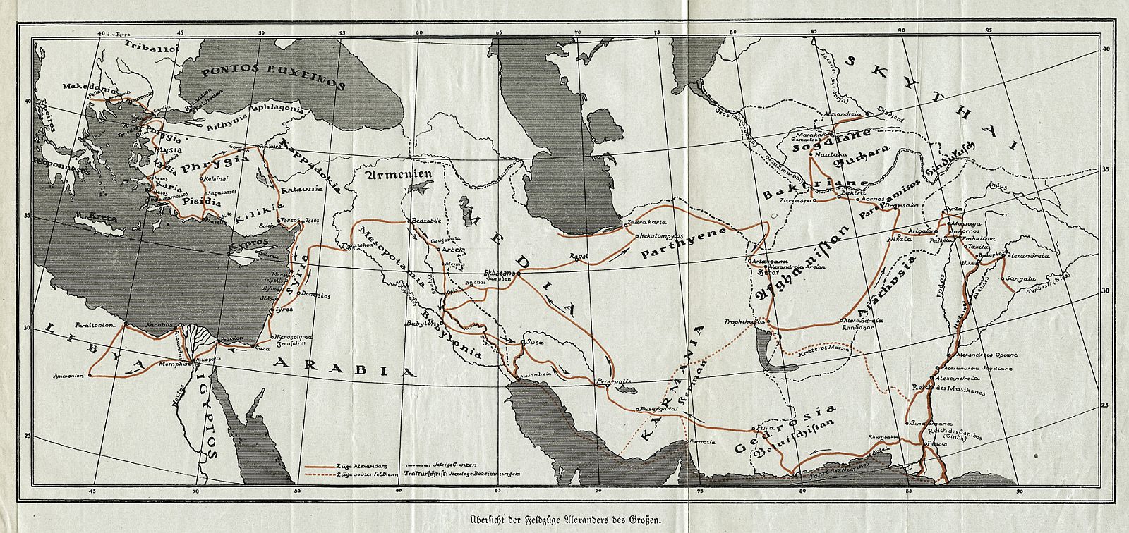 Hat aber auch für den Leser von 1917 die Geschichte Alexanders einen unmittelbaren Reiz, abgesehen von der Belehrung über eine wichtige Epoche der Vergangenheit? Man wird diese Frage wohl bejahen dürfen, und zwar wegen des hervorragenden kriegsgeschichtlichen Interesses, das die Feldzüge des makedonischen Königs erwecken. Man kann wohl sagen, daß wir bei der Eroberung des Perserreiches durch Alexander zum erstenmal in der Weltgeschichte die systematische Arbeit eines denkenden Generalstabs verfolgen können. Größere Truppenbewegungen sind natürlich auch schon in der Epoche vor Alexander erdacht und geleitet worden. Achtbar sind z. B. die Leistungen des Perserreichs auf diesem Gebiete. Als König Darius seinen sog. Skythenzug vorbereitete, hatte er eine Armee etwa aus der Gegend des heutigen Bagdad in die Dobrudscha zu versetzen: eine Leistung, die auch im Zeitalter der Eisenbahnen und Automobile recht achtbar wäre; um so mehr im Altertum mit seiner primitiven Technik. Aber die Soldaten des Perserkönigs hatten diesen Weg im eigenen Lande, unterstützt von der eigenen Reichsverwaltung zurückzulegen: das Feindesland begann eigentlich erst an der Donaumündung. Als nun aber die wirkliche militärische Aufgabe einsetzte, die Perser die untere Donau überschritten und in Beßarabien vordrangen, da begannen auch die Schwierigkeiten des Unternehmens deutlich zu werden: bekanntlich haben die Perser bald den Rückzug antreten müssen. Das ist etwa ein Beispiel für das militärische Können der Epoche um 500 vor Christus. Die kriegerischen Unternehmungen der griechischen Staaten des 5. und 4. Jahrhunderts zeichnen sich ebenfalls durch ihre Langsamkeit, Schwerfälligkeit und relative Ergebnis[Pg xix]losigkeit aus. Welch anderes Bild geben da die Feldzüge Alexanders! Die makedonische Armee beginnt ihre Offensive mit der Überschreitung der Dardanellen und schlägt einen starken, durchaus achtbaren Feind überall, wo sie ihn trifft. Ein geheimer Mechanismus scheint dieses Heer zu lenken, im Winter geht es ebenso vorwärts wie im Sommer, Flußlinien, Hochgebirgsketten, Wüsten werden glatt überwunden. Jede feindliche Festung fällt, wenn es auch manchmal recht viel Zeit und Mühe kostet. Etappenlinien von vielen Hunderten von Kilometern, im Feindesland, werden in Ordnung gehalten, weite Gebiete okkupiert und sofort in eigene Verwaltung genommen. So passiert diese Armee Kleinasien und dringt dann über Syrien nach Ägypten vor, es folgt der Vormarsch nach Mesopotamien, Babylon wird genommen, das eigentliche Persien betreten. Das gewaltige Iran wird durchzogen; über Afghanistan und den Hindukusch zieht die griechische Armee nordwärts bis tief in die Wüsten von Turkestan; daran schließt sich der letzte Akt: die Expedition nach Indien. All diese erstaunlichen Leistungen sind nicht denkbar ohne eine vorbedachte, mit einem fein verzweigten Apparat arbeitende Heeresleitung. Einen zwanzigjährigen König, und sei er noch so geistvoll, wird man nicht gut als den alleinigen Urheber solcher Erfolge ansehen: hier arbeitet ein Generalstab, so gut wie in den Operationen des deutschen Heeres 1870/71 oder 1914/17. Wir wissen auch genau, wer die Generalstäbler Alexanders gewesen sind: es sind die alten Generale aus der Schule seines Vaters, die sog. Adjutanten (Somatophylakes), welche dem König bei der Kriegführung zur Seite stehen, und als Chef des makedonischen Generalstabs tritt, auch noch in unserer höfisch gefärbten Überlieferung, der alte Parmenion deutlich genug hervor.
