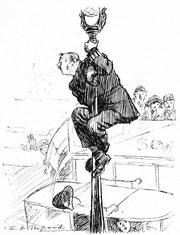 Everybody, of course, is aware that Professor Joff committed one of his notorious "howlers" when he derived "Carmelite"—in the street name—from "Cromwell's Heights." The latter, needless to say, must have been a deal nearer the South Kensington Museum than Whitefriars, famed for its sanctuary. Cromwell may have wandered in the meadows (if they still existed in his day) where the 6.30 News now leaps from its machines every afternoon about half-past five; he may even (as Plip and Johnstone surmise, in their ponderous tomes, Odd Corners in London and More and Odder Corners in London) have supped at the Pig and Mortarboard, which stood on what is now the site of the Ludgate Hill station booking-office (Plip, by-the-by, wrongly says not the booking-office, but the "bookstall," an amazing error in one usually so careful). But whatever else Cromwell did or did not do, he certainly never gave his name to any district further east than Knightsbridge.