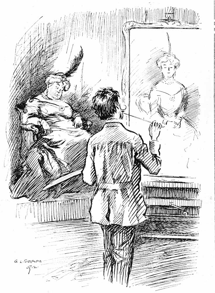"Yes, here is my photo and my wife's photo; my father's photo; my grandfather's daguerreotype; a black profile of my great-grandfather—certainly, gentlemen, I shall be only too pleased and proud to have them all reproduced in your scintillating, pulsating journals. So long, boys! Delighted to have met you."