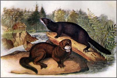 Mink, eating a muskrat, 47; tracks in the snow, 90, 91, 93; encounter with a fox, 90, 91; an enemy of the muskrat, 91; an encounter with a dog and a mysterious disappearance, 91, 92; as an eater of fish, 92; gait of, 93.