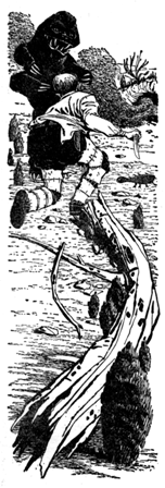 The trail showed well in the morning dew, going straight away along the hillside as if the thing were headed some place definite. Ed followed along for a quarter mile or so, then found himself on a fairly well beaten path, which presently joined another, and then another, till it was a definitely well used trail. It began to look to him like the thing might have a den of some sort, and he might be getting pretty close to it. He left the trail and climbed up into a lone tall tree, fire-scorched but still struggling for life. From there, he could follow the trail pretty well with his glasses for a couple of hundred yards before he lost it. Finally, he settled on a spot under an old burnt stump as a likely spot for the den.