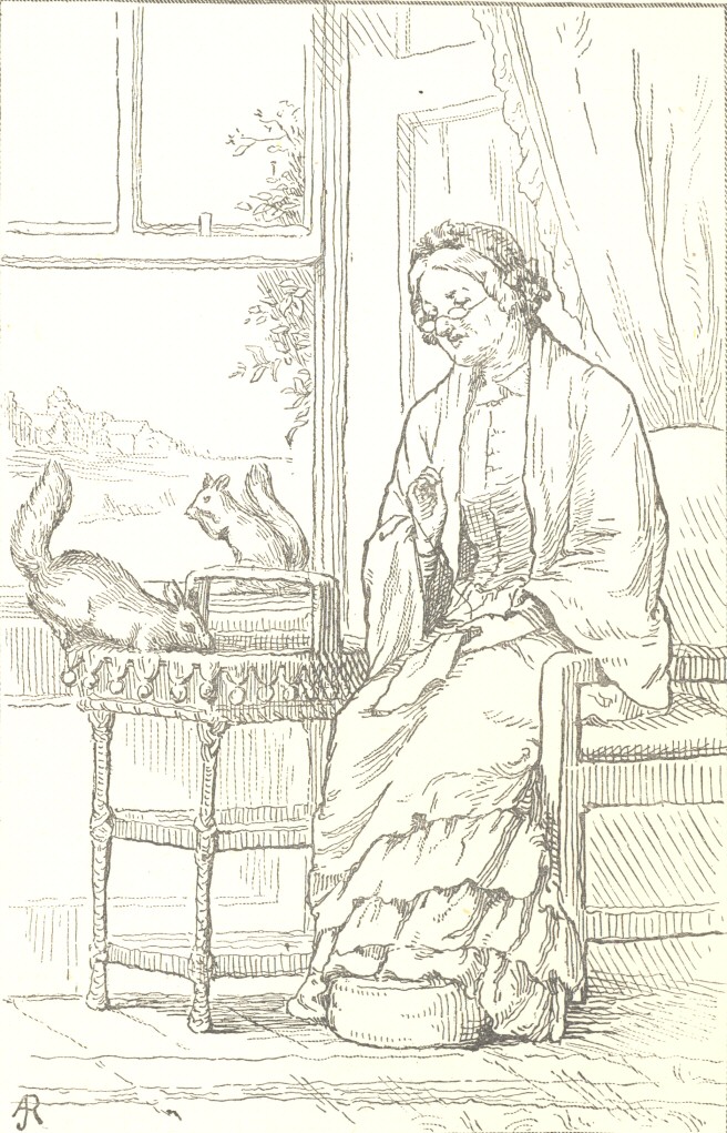 Now this good fairy that the squirrels discoursed about was a nice little old lady that the children used to call Aunt Esther, and she was a dear lover of birds and squirrels, and all sorts of animals, and had studied their little ways till she knew just what would please them; and so she would every day throw out crumbs for the sparrows, and little bits of bread and wool and cotton to help the birds that were building their nests, and would scatter corn and nuts for the squirrels; and while she sat at her work in the bow-window she would smile to see the birds flying away with the wool, and the squirrels nibbling their nuts. After a while the birds grew so tame that they would hop into the bow-window and eat their crumbs off the carpet.