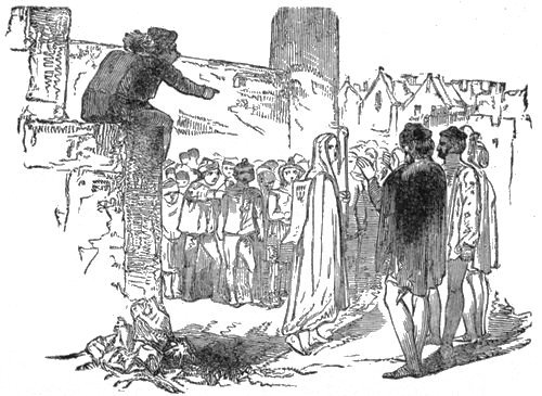 At the place where the combat was to be (p. 039) fought a large space was railed in by a very substantial barricade. The barricade was made very strong, so as to resist the utmost possible pressure of the crowd. Elevated seats, commanding a full view of the lists, as the area railed in was called, were erected for the use of the king and the nobles of the court, and all other necessary preparations were made. When the hour arrived on the appointed day, the king and the nobles came in great state and took their places. The whole square, with the exception of the lists and proper avenues of approach, which were kept open by the men-at-arms, had long since been filled with an immense crowd of people from the surrounding country. At length, after a brief period of expectation, the challenger, Anneslie, was seen coming along one of the approaches, mounted on a horse splendidly caparisoned, and attended by several knights and squires, his friends, all completely armed.