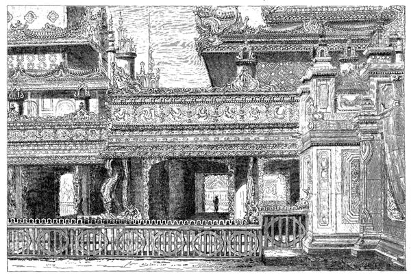 (p. 301) Le dessin de l'artiste birman fut apporté et offert à l'ambassadeur de la part du roi, qui, se levant alors brusquement de son sofa, disparut à travers les longues colonnades aux portes dorées. Ce fut la dernière fois que nous le vîmes.