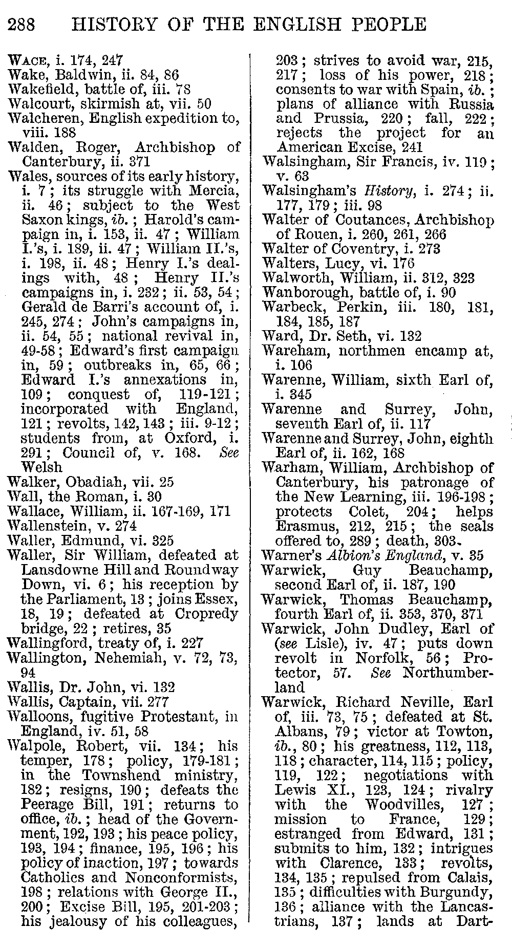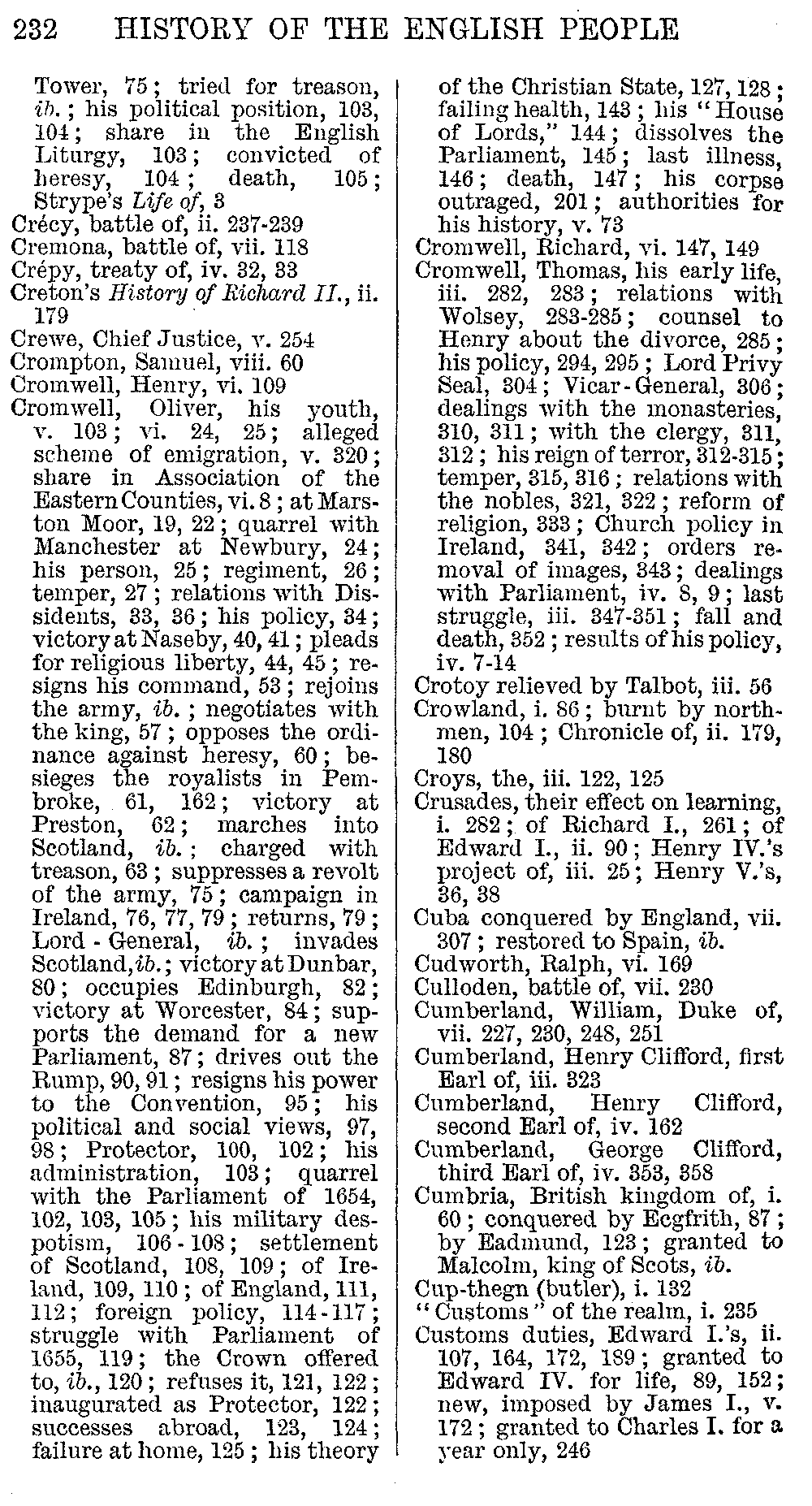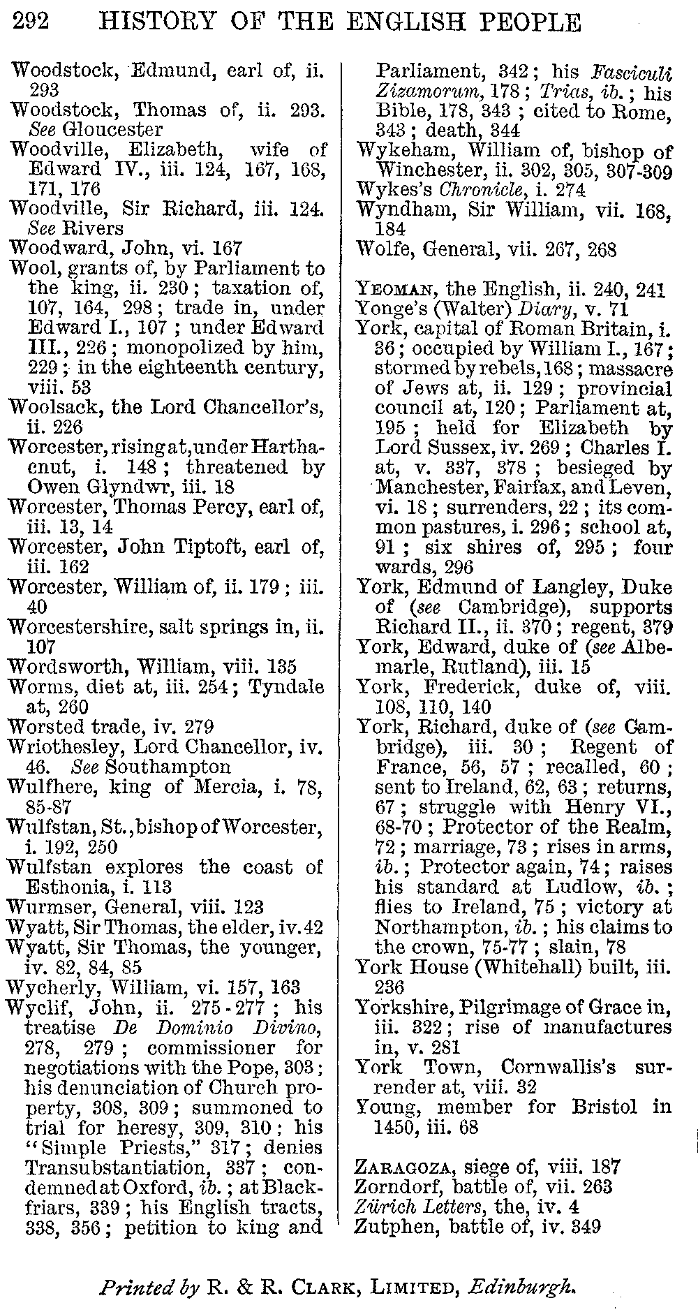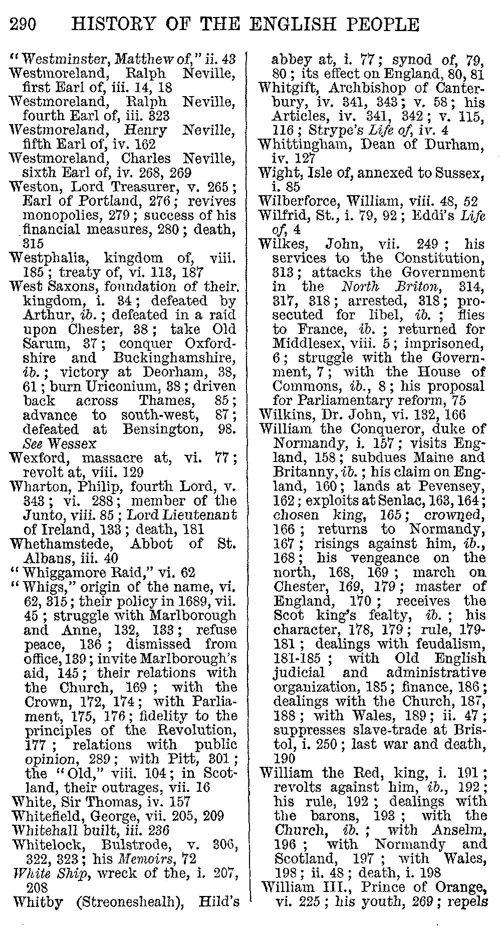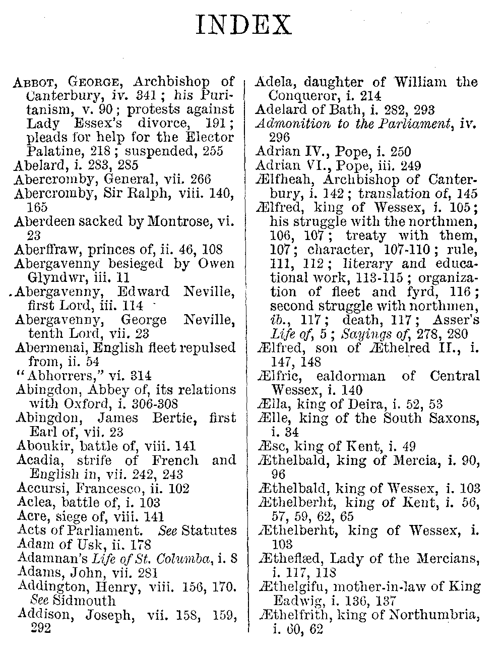 This is the index for the 8 volume set of History of the English People. It was included at the end of Volume VIII in the original. For ease in accessibility, it has been removed and produced as a separate volume. Click on the page number to see an image of the page.