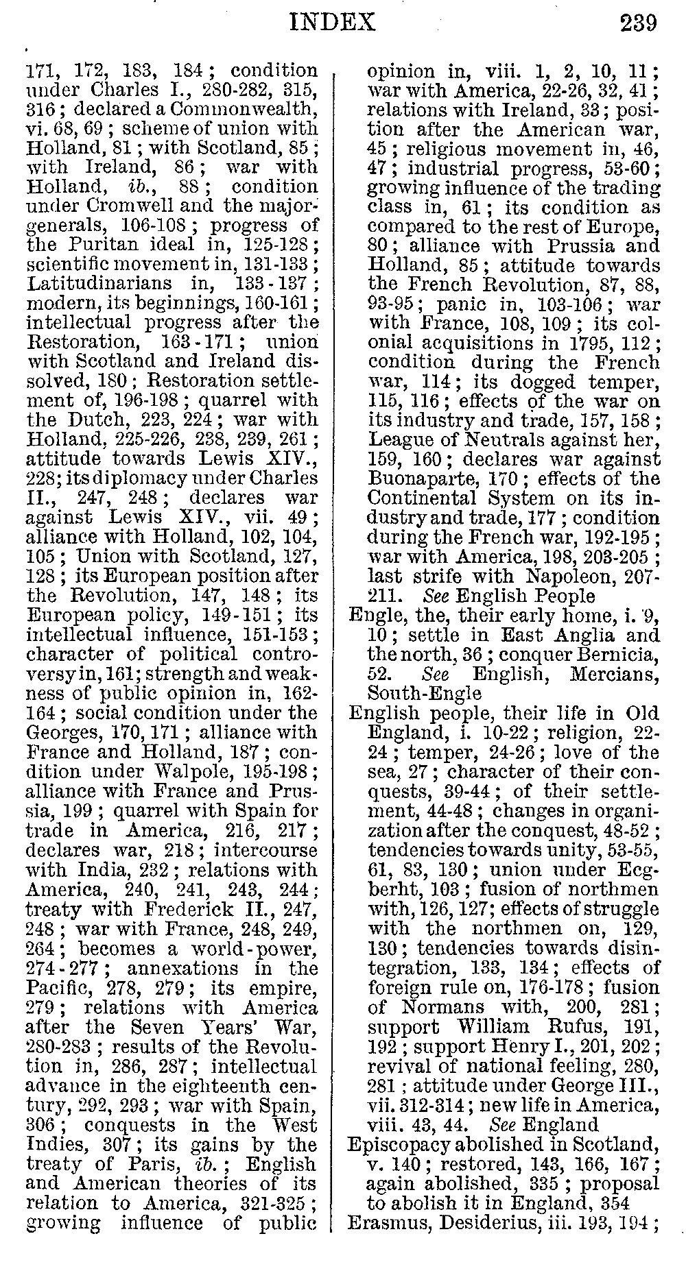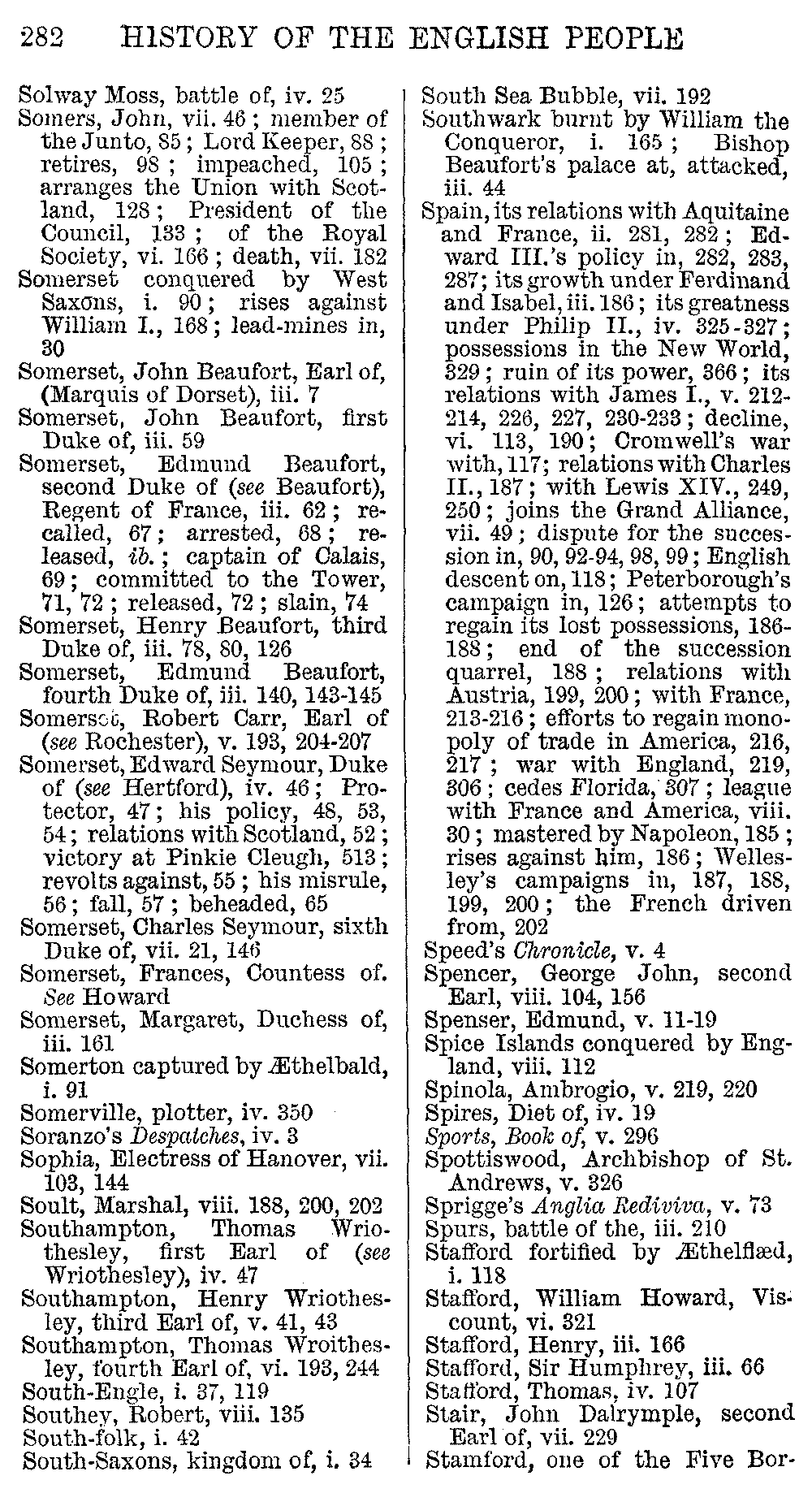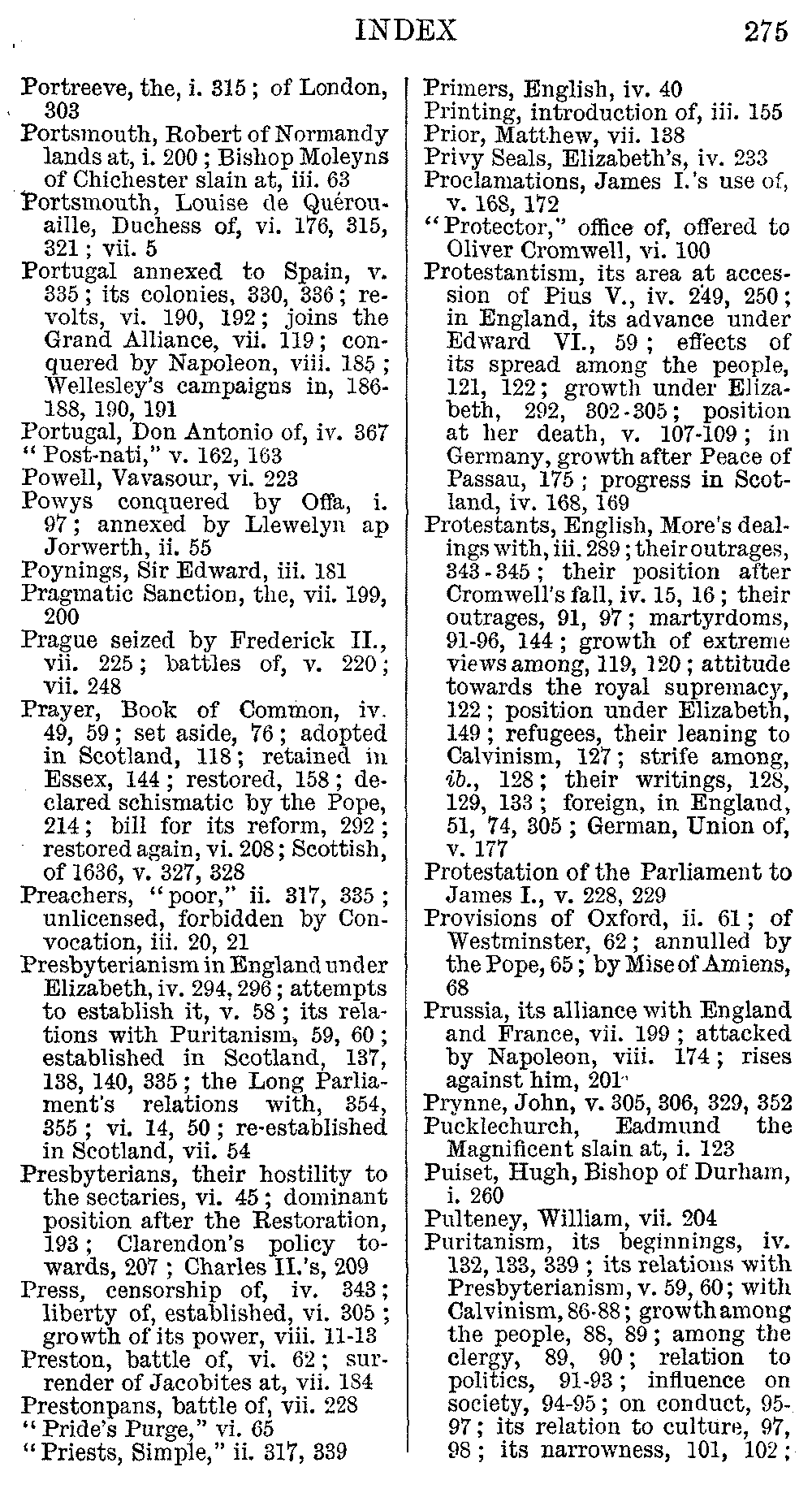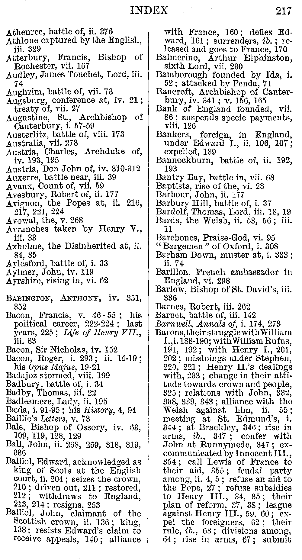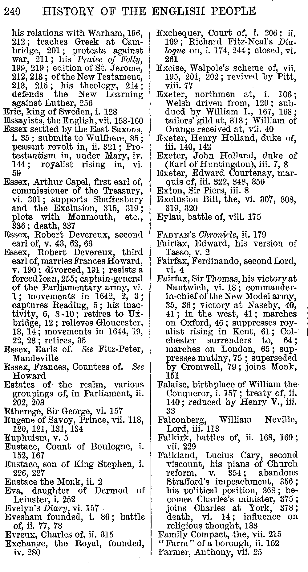 This is the index for the 8 volume set of History of the English People. It was included at the end of Volume VIII in the original. For ease in accessibility, it has been removed and produced as a separate volume. Click on the page number to see an image of the page.