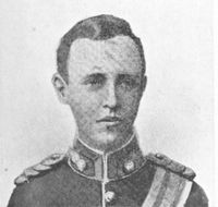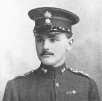 It was impossible for these three companies to advance any further, and they were therefore forced to limit their efforts to an attempt to keep down the Boer fire. Meanwhile, General Penn-Symons had, about 9.15 a.m., come up to the far edge of the wood, and crying, 'Dublin Fusiliers, we must take the hill!' crossed the wall. Shortly afterwards he received a mortal wound. Captain Weldon was also killed near the same spot in a gallant effort to help a wounded comrade, No. 5078 Private Gorman. Captain Weldon, together with several men of his company, had surmounted the wall in face of a heavy fire, and had taken cover in a small depression on its further side. Private Gorman was hit in the very act of surmounting the obstacle, and was falling backwards, when Captain Weldon, rushing out from his cover, seized him by the arm, and (p. 010) was pulling him into safety when he himself was mortally wounded. Privates Brady and Smith dragged him in under cover, but he only lived a few minutes. His dog, a fox-terrier named Rose, had accompanied him through the fight, and when his body was later on recovered, the faithful little animal was found beside it, and was afterwards taken care of by the men of 'E' company. There was no more popular officer in the regiment than George Weldon, and his loss was deeply felt by all ranks. He was the first officer of the Dublin Fusiliers to fall in the war, which thus early asserted its claim to seize the best. He was buried that same afternoon in the small cemetery, facing the hill on which he had met his death.