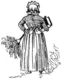 There she stopped, and stuffed her huge pockets with some of all the kinds of herbs. She took some tansy and peppermint, and caraway-seed and dill, spearmint and cloves, pennyroyal and sweet marjoram, basil and rosemary, wild thyme and some of the other time,—such as you have in clocks,—sappermint and oppermint, catnip, valerian, and hop; indeed, there isn't a kind of herb you can think of that the little old woman didn't have done up in her little paper bags, that had all been dried in her little[19] Dutch-oven. She packed these all up, and then went back with the children, taking her stick.